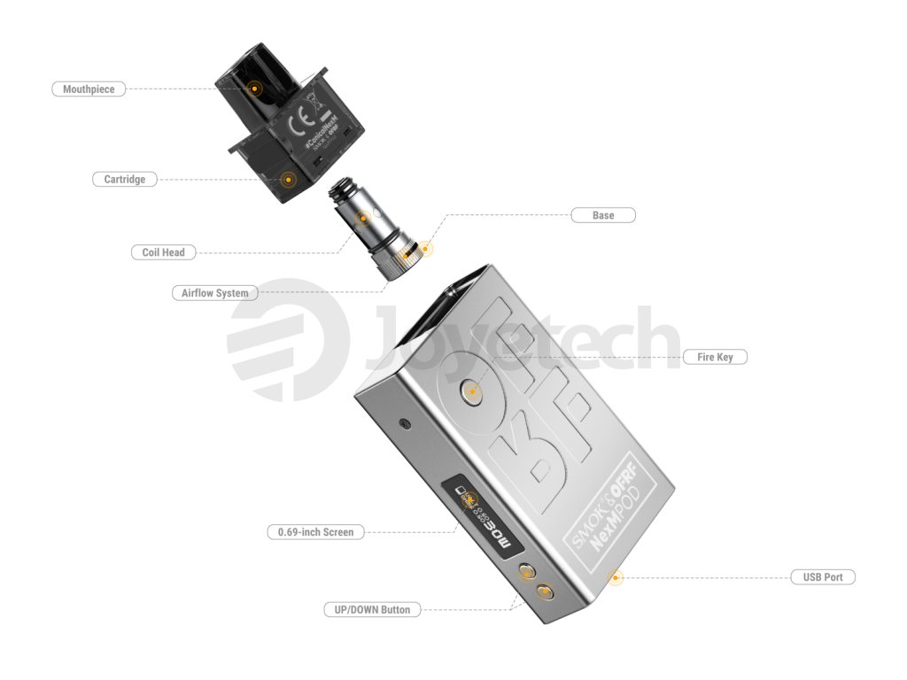 Ve spolupráci s firmou OFRF přistoupil výrobce SMOK k výrobě tohoto velmi kompaktního all-in-one Pod Modu, který však svými parametry může v klidu konkurovat svým o poznání větším zařízením. Veškerá elektronika, včetně cartidge pro náplň se ukrývá uvnitř pláště, který je kompletně vyrobený z hliníkové slitiny, která je velmi lehká a odolná. Elektronická cigareta nexM je k dostání rovnou v šesti barevných provedeních.