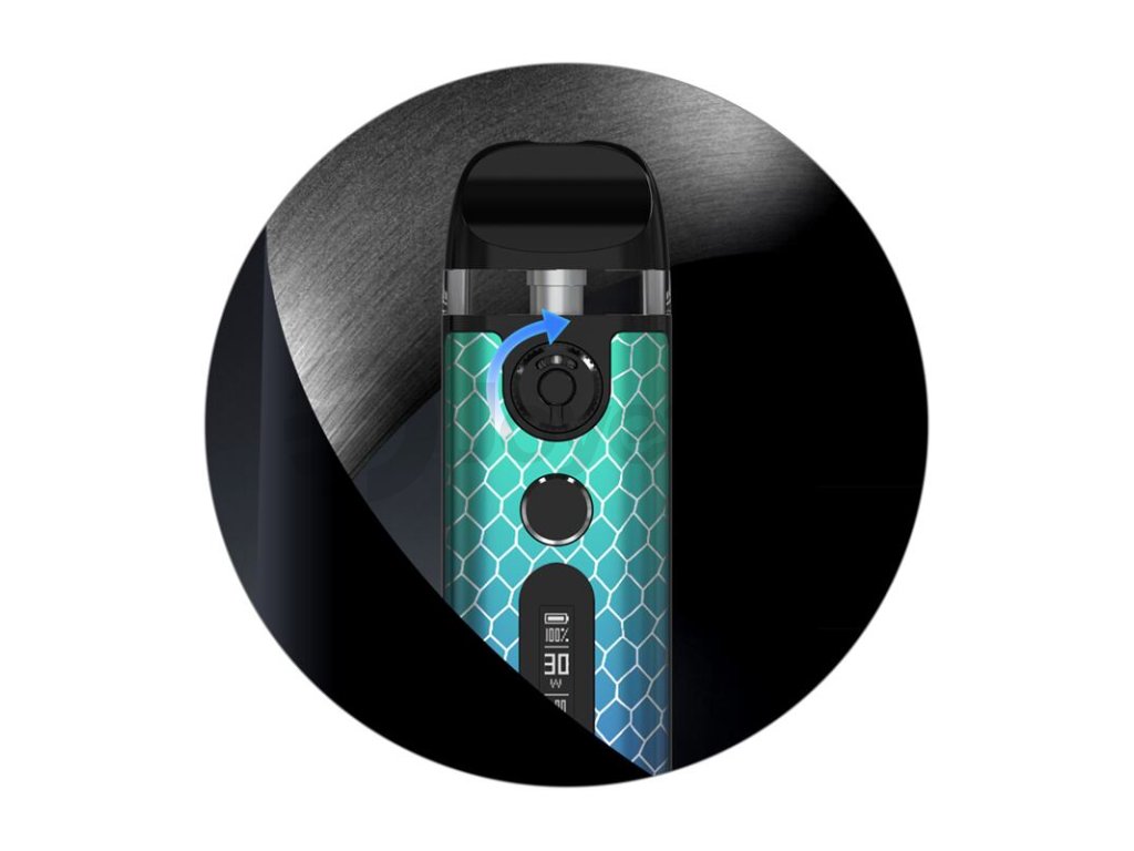 V přední části se potom nachází panel zařízení, který nabídne celou řadu nastavitelných prvků. Ve vrchní části tohoto panelu se nachází airflow kolečko pro rychlé nastavení přívodu vzduchu a ovlivnění výsledné tuhosti potahu, hned po tímto kolečkem najdete velké spínací tlačítko pro zapnutí a vypnutí, nebo pro sepnutí žhavení. Alternativně můžete využít také automatické spínání potažením z náustku. Pod tlačítkem se nachází displej a regulační tlačítko pro rychlé nastavení výstupního výkonu v rozpětí 5 - 30 W, můžete si tak libovolně upravit výkon pro potřeby utaženého MTL, nebo volného MTL potahu. K tělu je ve vrchní části přichycena mesh cartridge s objemem 2 ml, praktickým vrchním plněním a integrovaným tělískem o odporu 0,7 ohm, které nabídne příjemný kompromis právě mezi oběma metodami MTL potahování. SMOK Novo 5 Pod Kit je do detailu vyladěný pod systém, který splní všechny vaše požadavky.