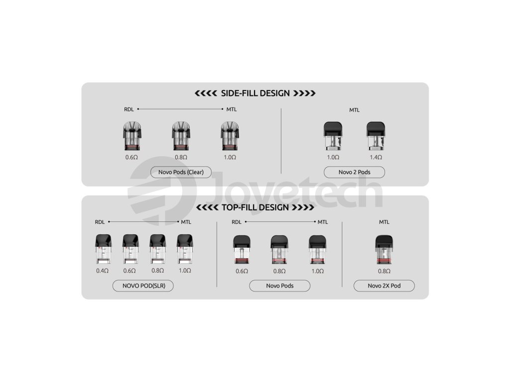 Platforma NOVO nabízí obrovskou škálu náhradních cartridgí, jejichž hlavní předností je to, že jsou vzájemně kompatibilní. Vybírat můžete z různých typů s bočním či horním plněním, mesh pletivo i tradiční spirálku. Všechny dokáží zprostředkovat velice autentickou chuť vašeho oblíbeného e-liquidu. Široký rozsah dostupných odporů pro MTL a RDL vaping uspokojí většinu vaperů.