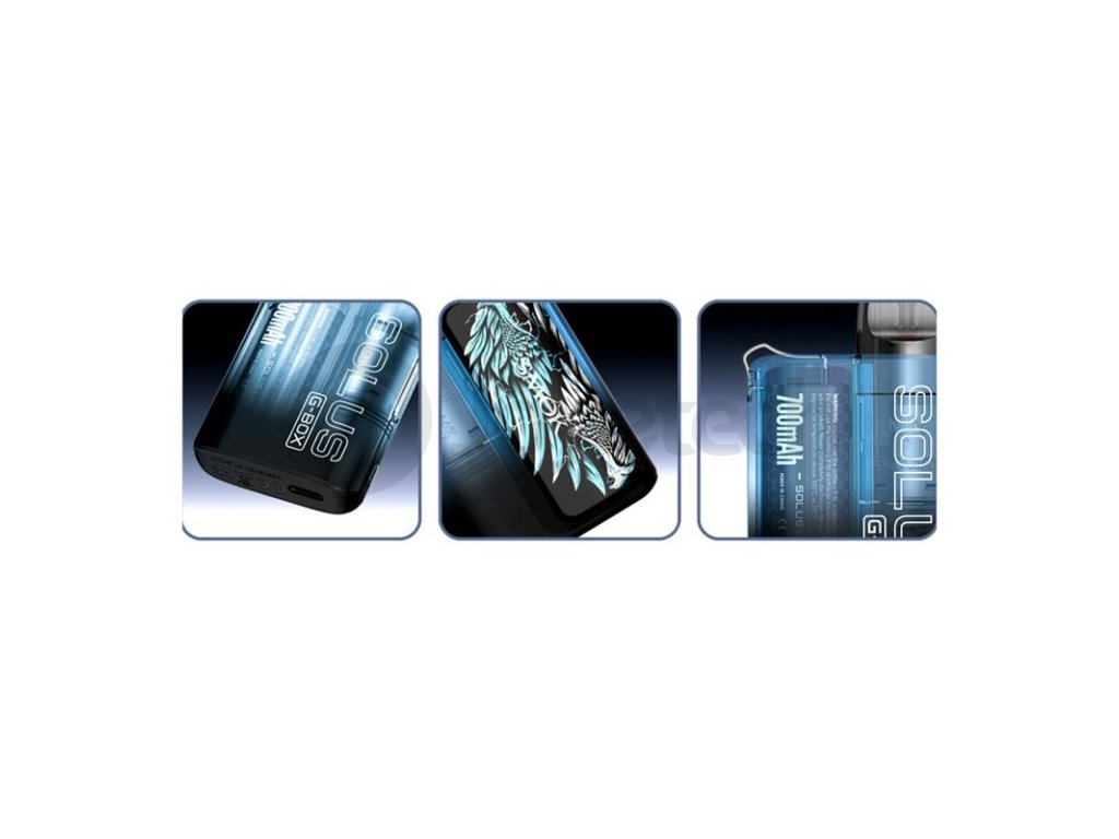 V těle modelu Solus G-Box se nachází integrovaná baterie se solidní kapacitou 700 mAh pro mnohahodinový nerušený provoz, stabilní chod a výkon a pro bezproblémovou funkčnost. Baterie je vybavena také řadou bezpečnostních ochran pro pohodový a bezpečný vaping. Nesmí chybět ani podpora moderního USB-C nabíjení, zařízení podporuje nabíjení proudem až do 0.77A.