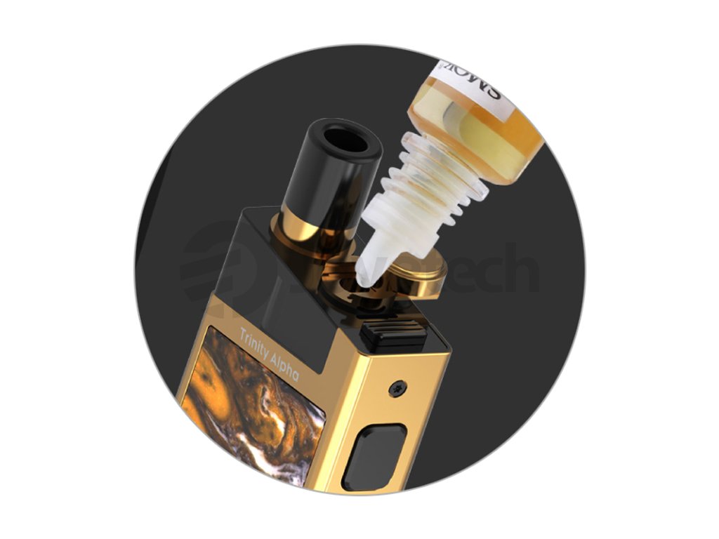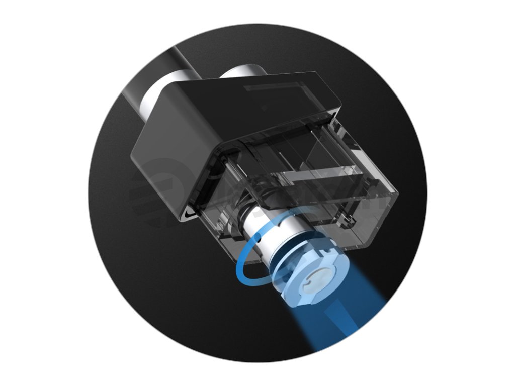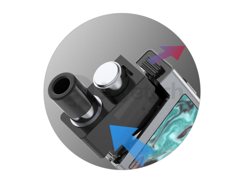 Plnící otvor pro plnění cartridge se nachází hned vedle náustku. U tohoto modelu se nachází jedinečný systém výsuvného plnícího otvoru, který stačí pouze vysunout do strany a začít plnit. Celý proces zabere jen několik málo vteřin a následně se můžete opět uchýlit k pohodovému vapování.