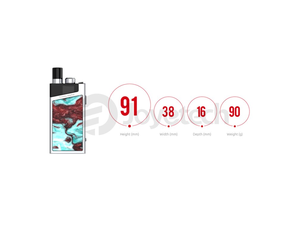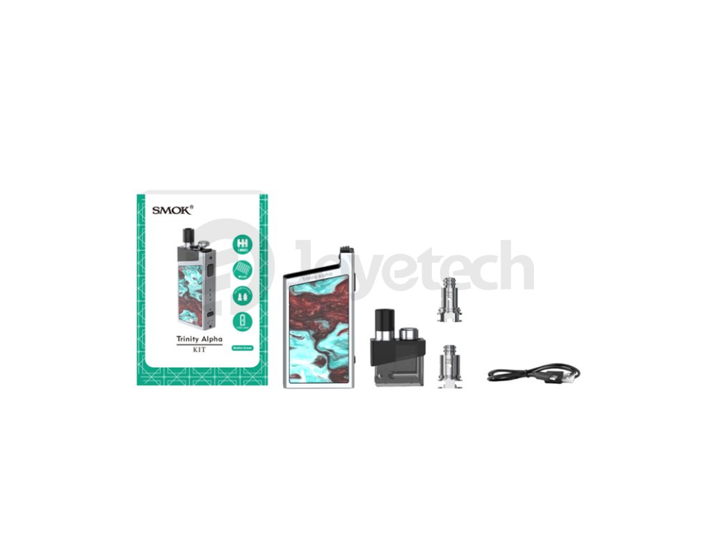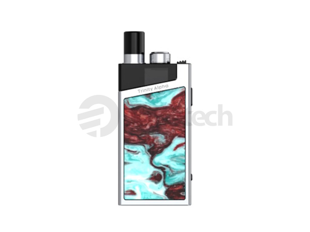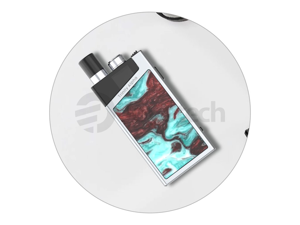 SMOK Trinity Alpha Resin Pod Kit je elegantní elektronická cigareta, která se hodí jak pro každodenní vaping, tak také do společnosti. Stylové resinové boční panely příjemně dotváří celkový dojem a výsledek je naprosto úchvatný. Díky praktickým rozměrům navíc skvěle padne do každé ruky a příjemně se z ní vapuje. Rozměry činí jen 91 x 38 x 16 mm.