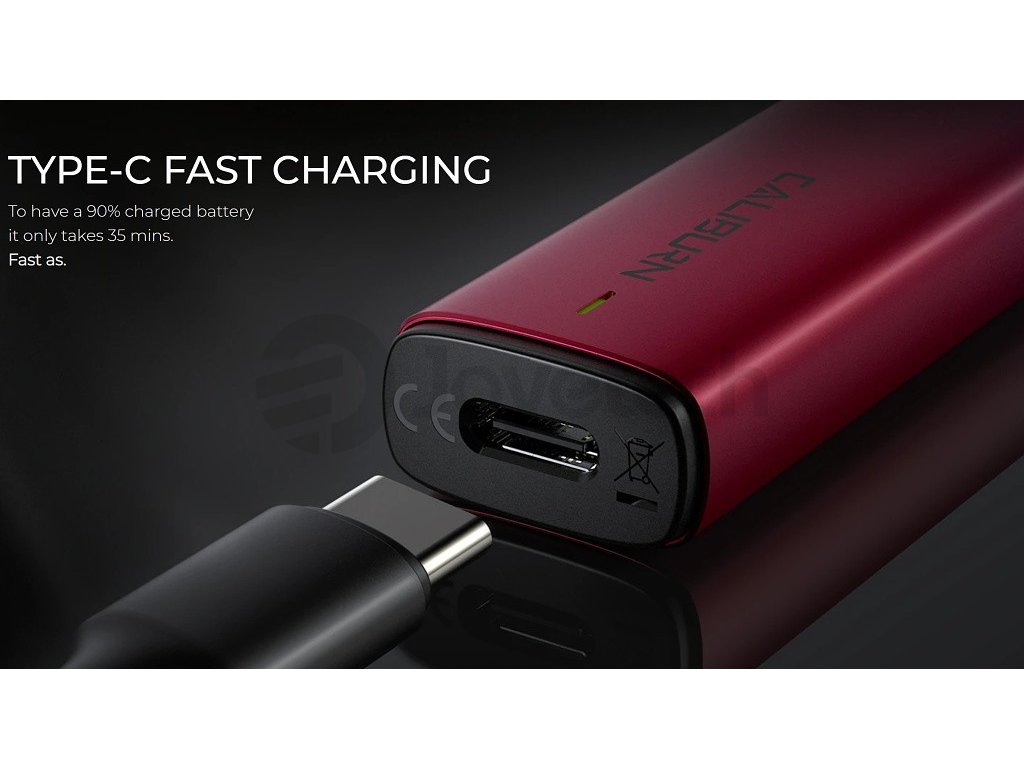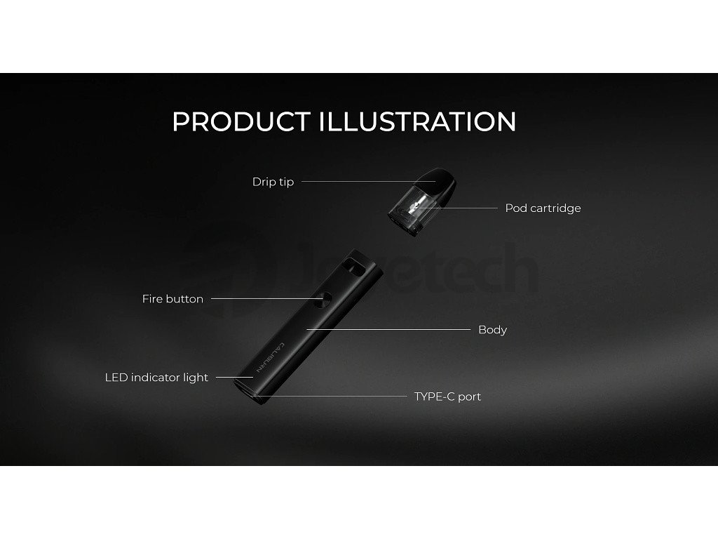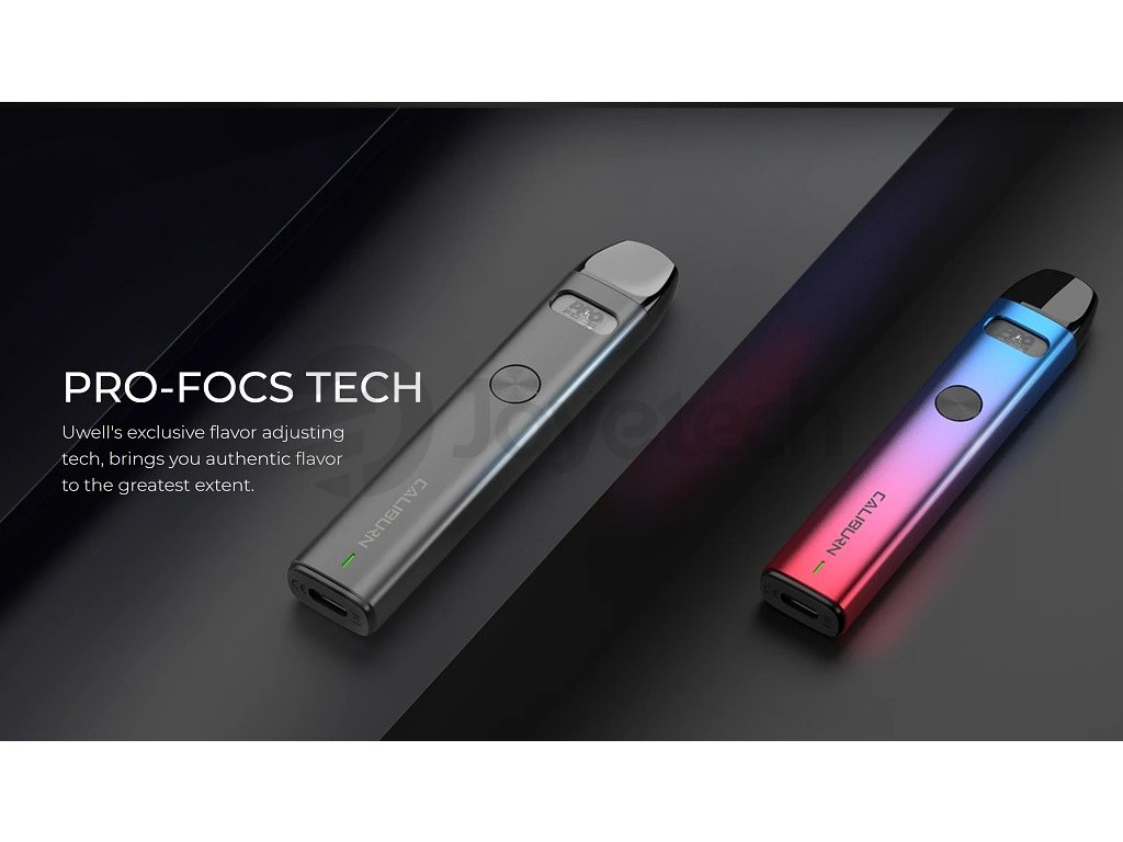 Pod elektronická cigareta vhodná pro MTL styl vapování s celkovým výkonem 15W, cartridge s objemem 2ml a Mesh žhavící hlavou s technologii kvality chuti Pro-FOCS s celkovým odporem 0,9ohm, vestavná baterie s kapacitou 520mAh, USB-C nabíjení, tělo z hliníkové slitiny, rozměry 110 x 21,3 x 11,7 mm. Možnost automatické i manuální aktivace potahu. Opakovaně plnitelná Pod Cartridge Caliburn A2.