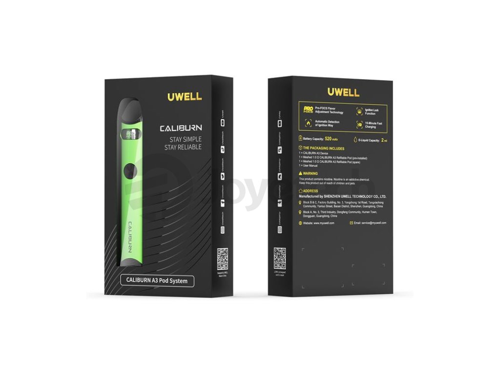 Uwell Caliburn A3 Pod Kit je elektronická cigareta zaměřená zejména na vytříbené podání chuti všech populárních e-liquidů. Je vybavena upgradovanou technologií kvality chuti Pro-FOCS, která vám zprostředkuje mimořádný chuťový zážitek při každém potahu. Ten je navíc umocněn přítomností integrovaného tělíska uvnitř cartridge s odporem 1,0 ohm a provedením FeCrAl Meshed pro rychlý náběh žhavení.