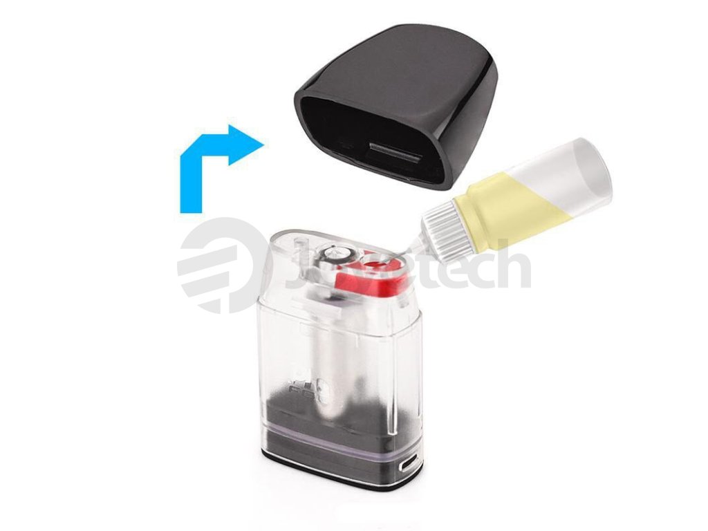 O stavu e-liquidu uvnitř cartridge budete neustále informováni díky postrannímu průhlednému průzoru. Jakmile bude docházet e-liquid, postačí z cartridge sejmout náustek zatlačením do strany. Poté již můžete začít plnit. Pro samotný proces plnění nebudete muset cartridge ani odpojovat. Naplněno máte během pár vteřin, poté se můžete opět věnovat vapování.