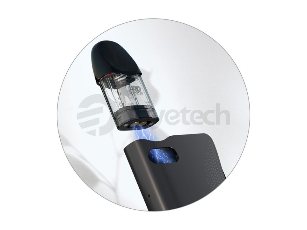 Cartridge v základním balení disponuje objemem 2 ml a klade maximální důraz na prokreslenou chuť. Pro snadné zjištění stavu e-liquidu uvnitř cartridge poslouží transparentní průzor umístěný právě u kontaktu pro nasazení cartridge. V případě, že se dostanete s e-liquidem pod rysku, jednoduchým pohybem odklopíte náustek a doplníte si e-liquid zpět do plné kapacity. Celý proces zabere jen pár vteřin. Díky průzoru se navíc nemůže stát, že by vám došel během potahování e-liquid, budete mít neustálý přehled.