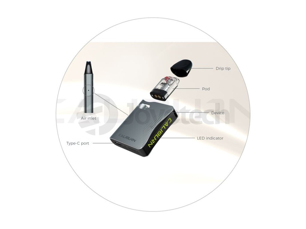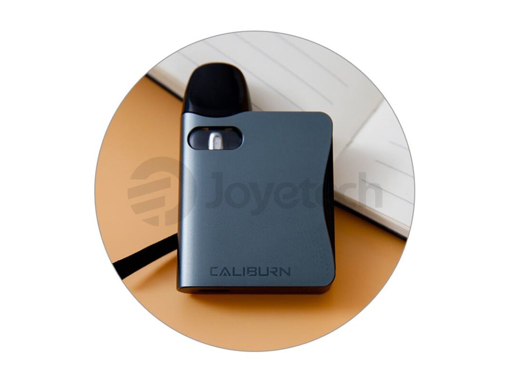 V boční části se nachází unikátní LED indikace, která slouží pro snadné zjištění stavu baterie. Podsvícené logo CALIBURN v boční části je navíc vybaveno stylovou animací, která se spustí po ukončení potahu. Logo začne měnit svou barvu a dodá celé e-cigaretě futuristické vzezření. Funkci animace bočního panelu si navíc můžete v případě potřeby kdykoliv deaktivovat, postačí jen třikrát odpojit cartridge od těla.