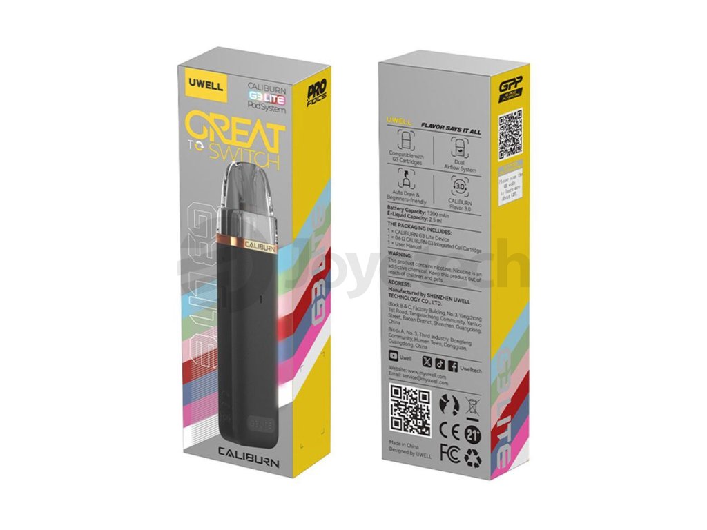 Dostupná elektronická cigareta Uwell Caliburn G3 Lite Pod Kit navazuje na zaběhnutou tradici vyladěných pod systémů Caliburn, přináší opět maximální důraz na výraznou chuť a jednoduché funkce pro snadné používání. Model G3 Lite přináší kompatibilitu s platformou cartridgí Caliburn G3, které dlouhodobě ohromují kvalitně zpracovanou konstrukcí a výrazným podáním chuti díky nejnovějším technologiím výroby. Integrovaná baterie s kapacitou 1200 mAh zajistí déletrvající požitek z vapingu s minimem nabíjení a funkce automatického nastavení výkonu s automatickým spínáním potahu se postarají o komfortní každodenní vaping.