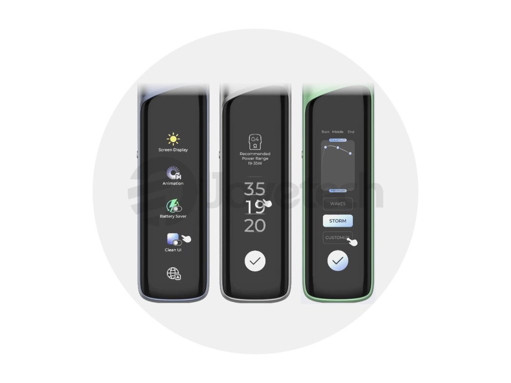 Storm, Waves a Custom - tři výstupní režimy, kterými si můžete obohatit váš vaperský zážitek. Režim Storm nabízí silný hit a bohatou chuť, Waves plynulý nástup s vyváženým profilem a konečně Custom, který vám dává naprostou svobodu v nastavení. Průběh výkonu si jednoduše upravíte ve třech fázích každého potahu - na začátku, uprostřed a na konci.