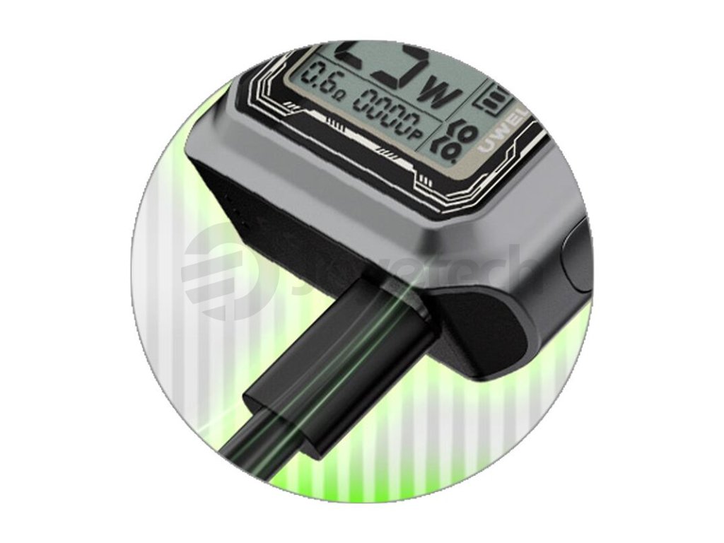 Přední část zdobí krásný segmentový digitální LCD displej, který umně dokresluje celkový vzhled zařízení. Výhodou segmentového displeje je zejména nižší odběr energie během používání, displej tak značně šetří vaši baterii, kterou spotřebováváte téměř výhradně pouze vapováním. Na displeji budete mít navíc neustálý přehled o všech potřebných parametrech během používání.