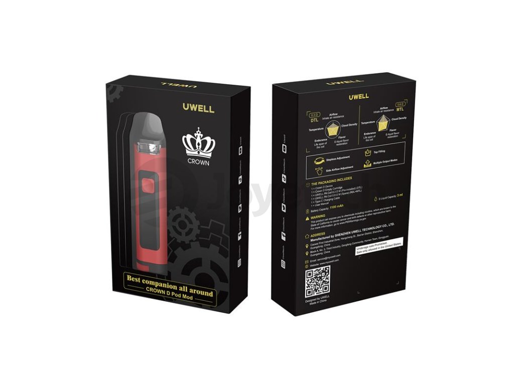 Uwell Crown D Pod Kit je elegantní a stylová elektronická cigareta s nabušenou výbavou, která je k dostání v celé řadě barevných variací. Celé tělo je potom vyrobeno z lehoučké hliníkové slitiny, přičemž hmotnost celé konstrukce se zastavila na krásných 59 g. Rozměry těla potom činí 106 x 28 x 18,5 mm, díky praktickému designu ji snadno uložíte do kapsy a příjemně se drží také v dlani během vapování.