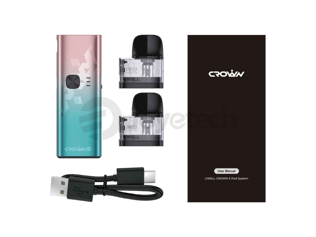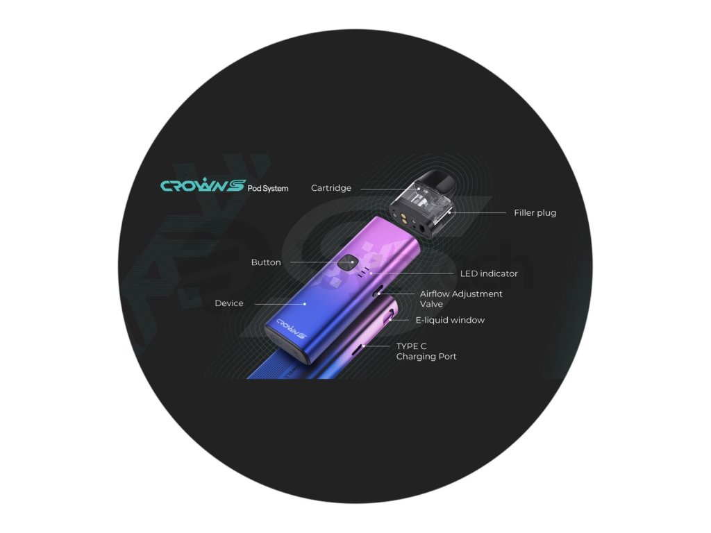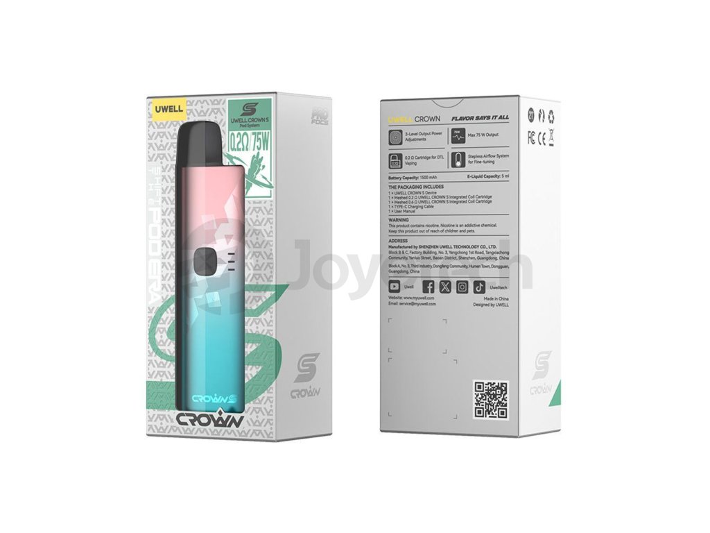 Uwell Crown S Pod Kit se pochlubí mimořádným výkonem a novými cartridgemi, které více než zdařile konkurují tradičním tankům a atomizérům. Překonávejte limity díky podpoře maximálního výkonu až do 75W s automatickým nastavením a třemi režimy intenzity žhavení. S tímto zařízením si budete moci užívat ten nejchutnější DL a RDL vaping díky cartridgím s odpory 0,2ohm a 0,6ohm v základním balení. Mimo skvělé parametry a praktické funkce se pyšní také perfektní ergonomií, stylovým designem a elegantními křivkami pro snadné držení v dlani. Uwell Crown S Pod posouvá hranice ve využití pod systémů a přináší vychytané funkce jak pro začátečníky, tak také pro pokročilé vapery, kteří jinak holdují spíše vlastním atomizérům.