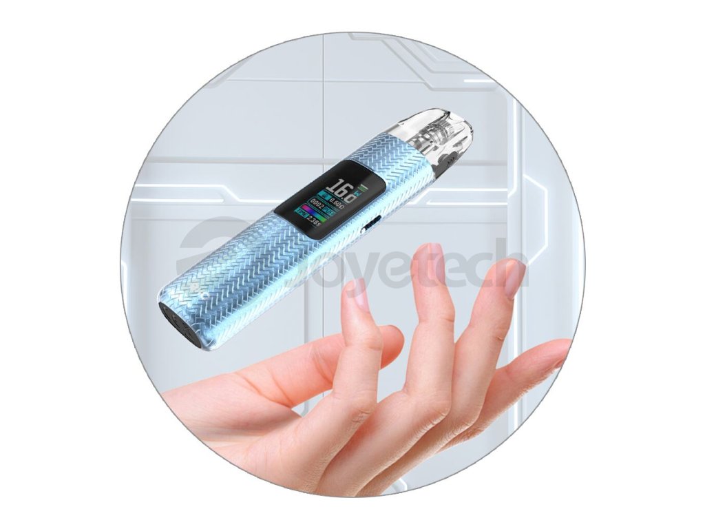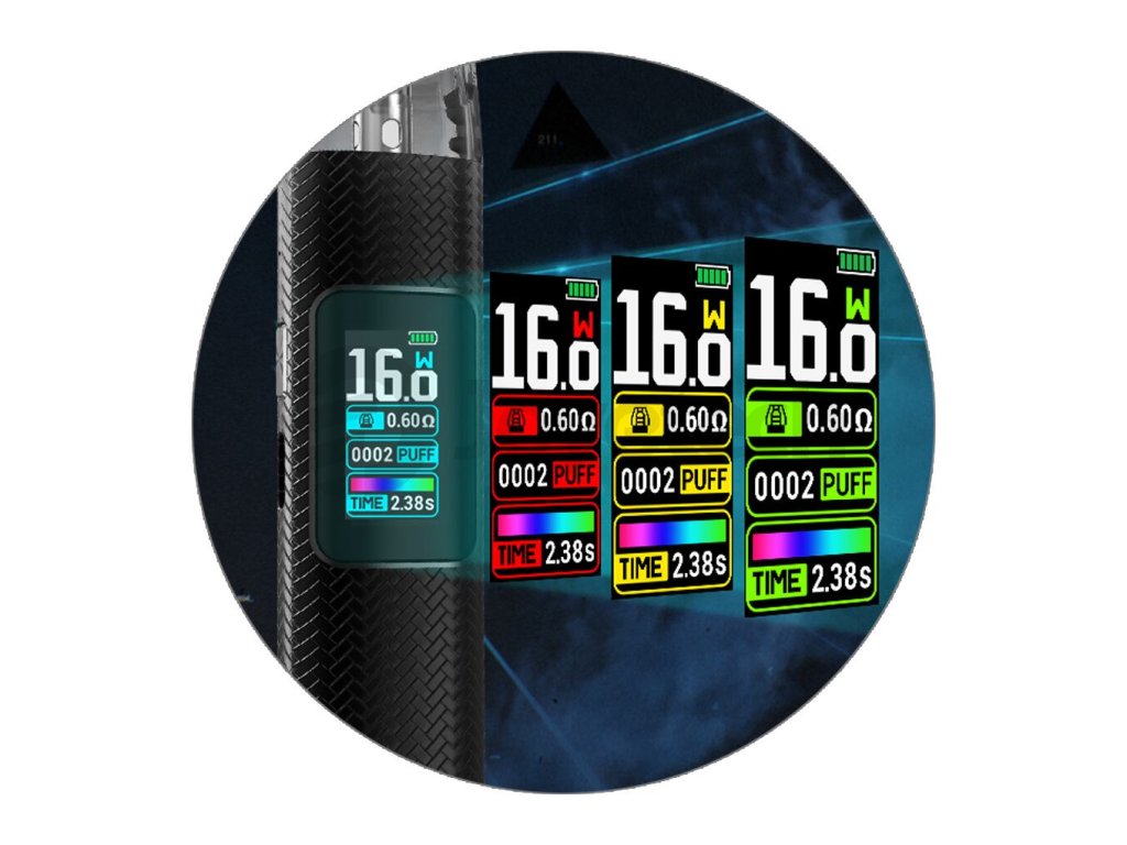 Hlavní výsadou zařízení je barevný TFT displej na předním panelu. Ten vás neustále informuje o stavu baterie, nastaveném výkonu, počtu potahů, odporu cartridge a čase posledního potahu. Díky barevnému rozhraní je nastavení jednodušší, než kdykoliv předtím.