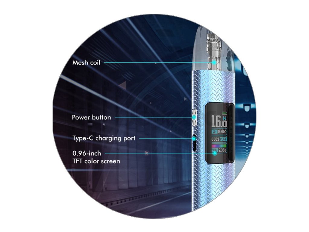 Hlavní výsadou zařízení je barevný TFT displej na předním panelu. Ten vás neustále informuje o stavu baterie, nastaveném výkonu, počtu potahů, odporu cartridge a čase posledního potahu. Díky barevnému rozhraní je nastavení jednodušší, než kdykoliv předtím.