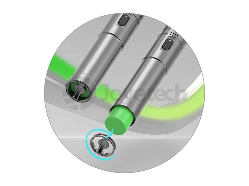 Přímo nad spínacím tlačítkem se nachází kroužek pro regulaci airflow, který slouží pro plynulé nastavení přívodu vzduchu do atomizéru během potahu. Otáčením kroužku si tak přizpůsobíte velikost vzduchových otvorů a ovlivníte tím výslednou tuhost potahu. Ať už preferujete volnější, nebo utaženější potah, s tímto modelem si snadno vyzkoušíte obě varianty.