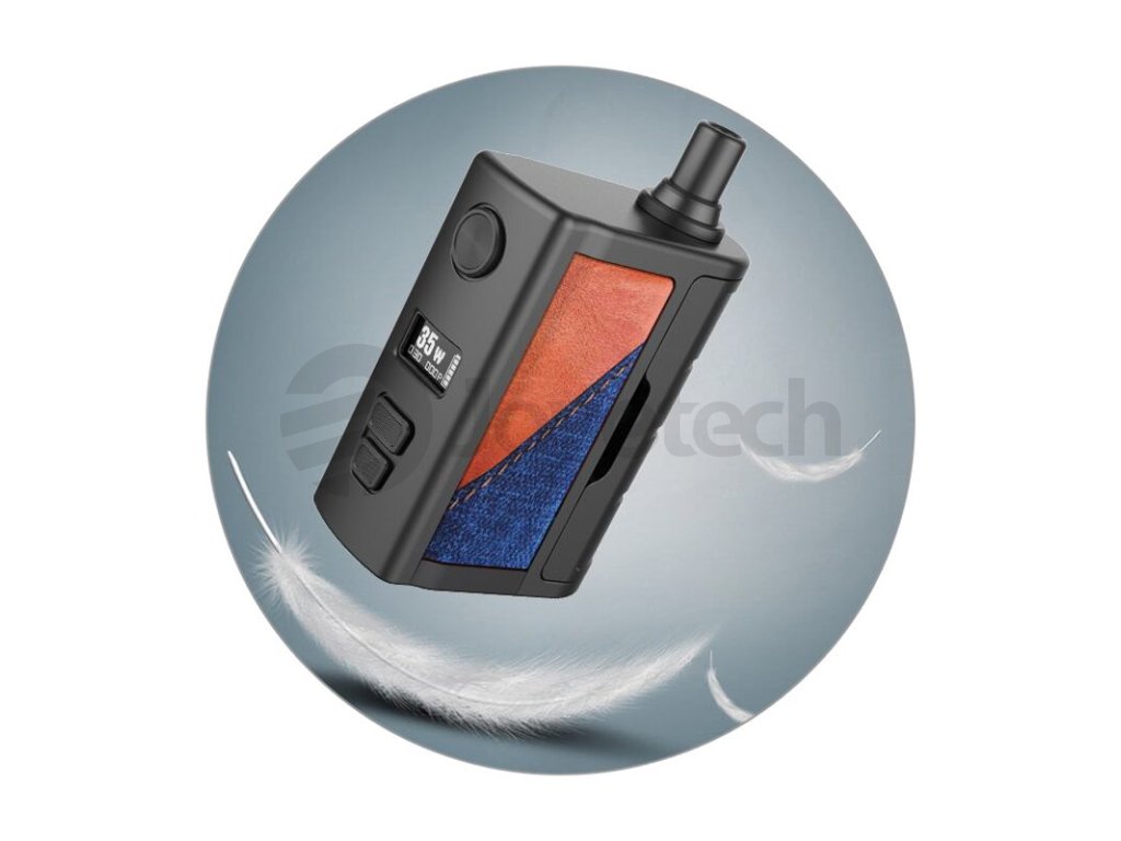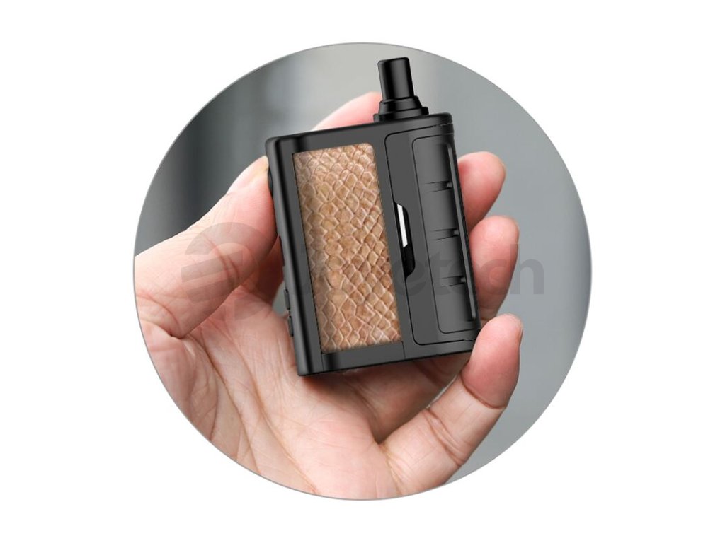 Vandy Vape Rhino Pod Kit je malá a kompaktní e-cigareta, kterou velice snadno schováte do kapsy a budete si ji moci pohodlně vzít kamkoliv s sebou. Její rozměry činí krásných 47,6 x 75,4 x 25 mm. Celé tělo se navíc příjemně drží v ruce také během potahu. Hmotnost e-cigarety činí pouhých 77 g, během potahu ji proto téměř ani neucítite v dlani. K dostání je hned v šesti barvách se stylovým koženým panelem v boční části.
