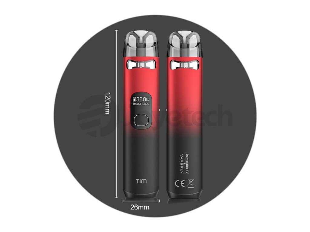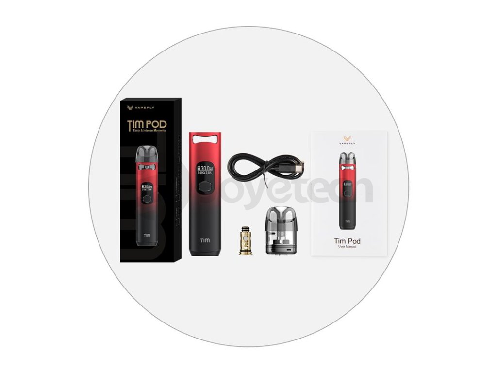 Vapefly Tim Pod Kit je krystalizací spolupráce renomovaného německého recenzenta Dampfalot TV a společnosti Vapefly. E-cigareta si klade za cíl zprostředkovat uživatelům ten nejlepší zážitek z vapingu díky prvotřídní elektronice a minimalistickému designu. Mimořádné podání chuti, perfektní funkčnost a snadná uživatelská obsluha činí z modelu naprosto neodolatelný kus pro každodenní vaping.