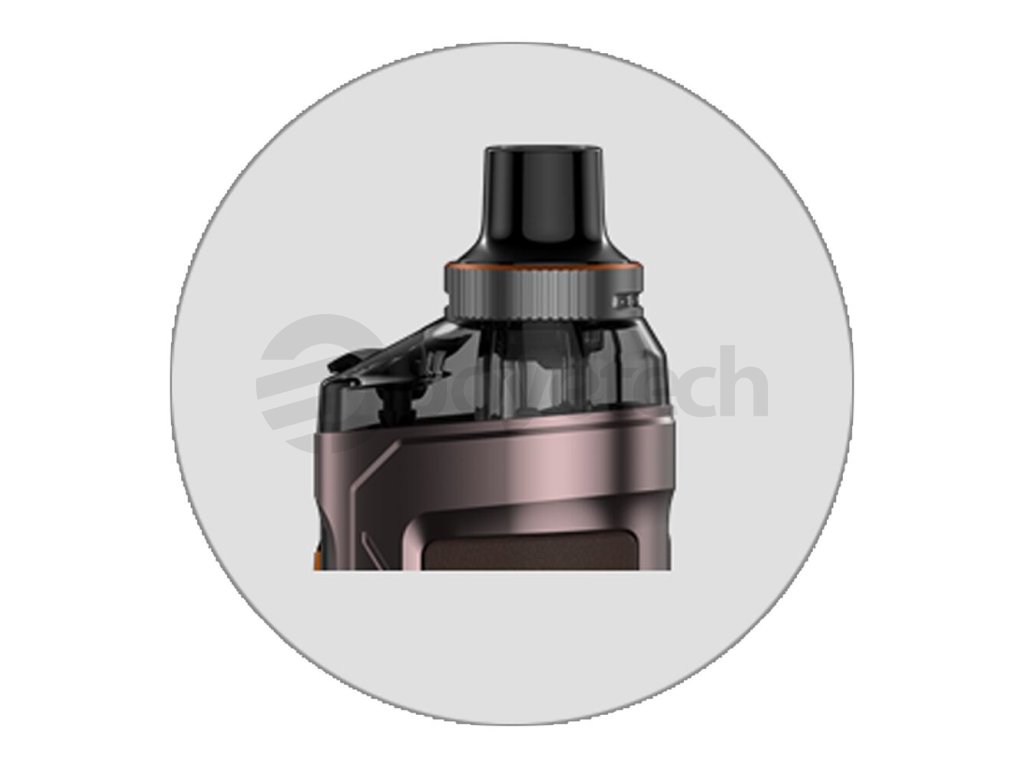 Ve vrchní části zařízení najdete novou cartridge Vaporesso Armour G Series s obrovským objemem. Hravě do ní doplníte až 5ml e-liquidu. S tímto slušným zásobníkem se můžete těšit na dlouhé hodiny intenzivního odpařování s minimem doplňování. A právě samotné plnění je vymyšleno u cartridge velmi intuitivně. Nachází se v horní části a tvoří ho pouze praktická silikonová záslepka. Do plné kapacity tak zvládnete cartridge naplnit čistě a rychle, doslova za pár vteřin.