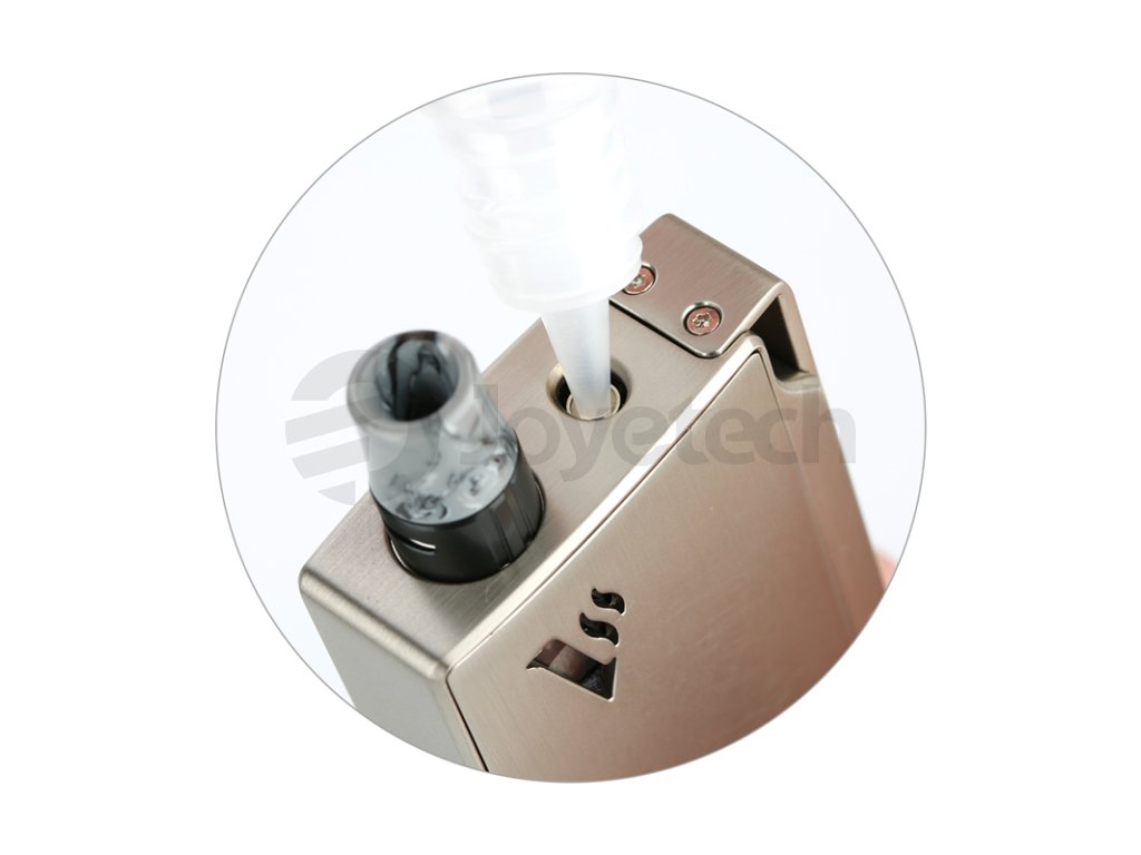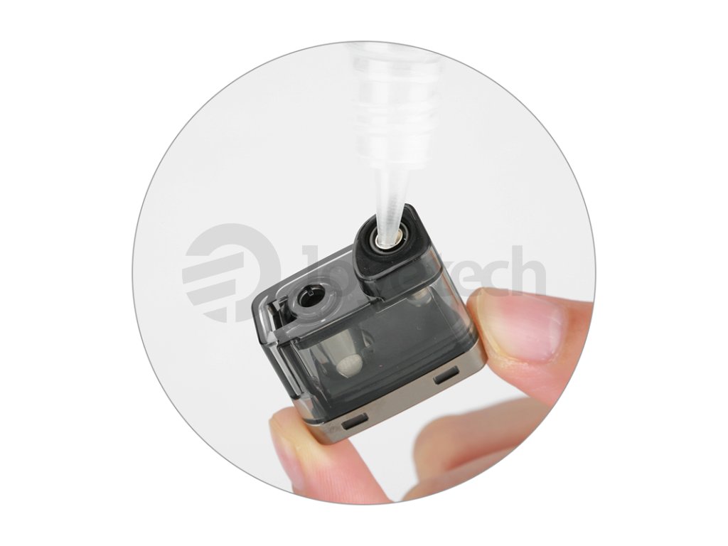 Ve vrchní části cartridge se nachází intuitivní systém plnění s označením PTF. Na plnící uzávěr tedy postačí pouze zatlačit lahvičkou s e-liquidem a začít plnit. Tento uzávěr po doplnění automaticky uzavře plnící systém, aby e-liquid nemohl uniknout z cartridge ven. V balení také najdete prázdnou lahvičku s objemem 10 ml pro snadné používání tohoto plnícího systému.