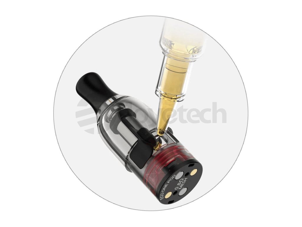 Cartridge modelu ECO ONE nabídnou základní objem 2 ml a velice rychlou metodu opětovného doplňování. V jejich boční části se nachází praktická silikonová záslepka, po jejímž otevření můžete ihned začít plnit. Celý proces plnění je rychlý a čistý, zabere jen pár vteřin. Poté se můžete opět pustit do vapování.