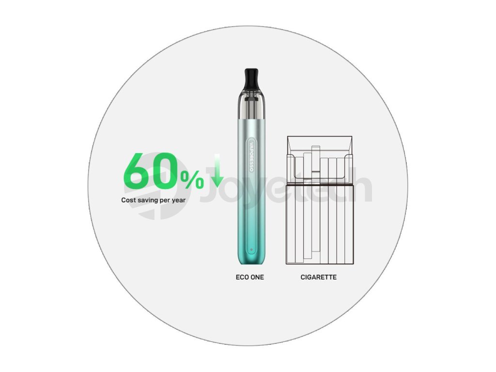 Používání modelu Vaporesso ECO ONE při celoročním používání šetří vaši peněženku až o 60% proti užívání klasických cigaret. Snižte své výdaje na minimum a užívejte si vapování bez zbytečných starostí.