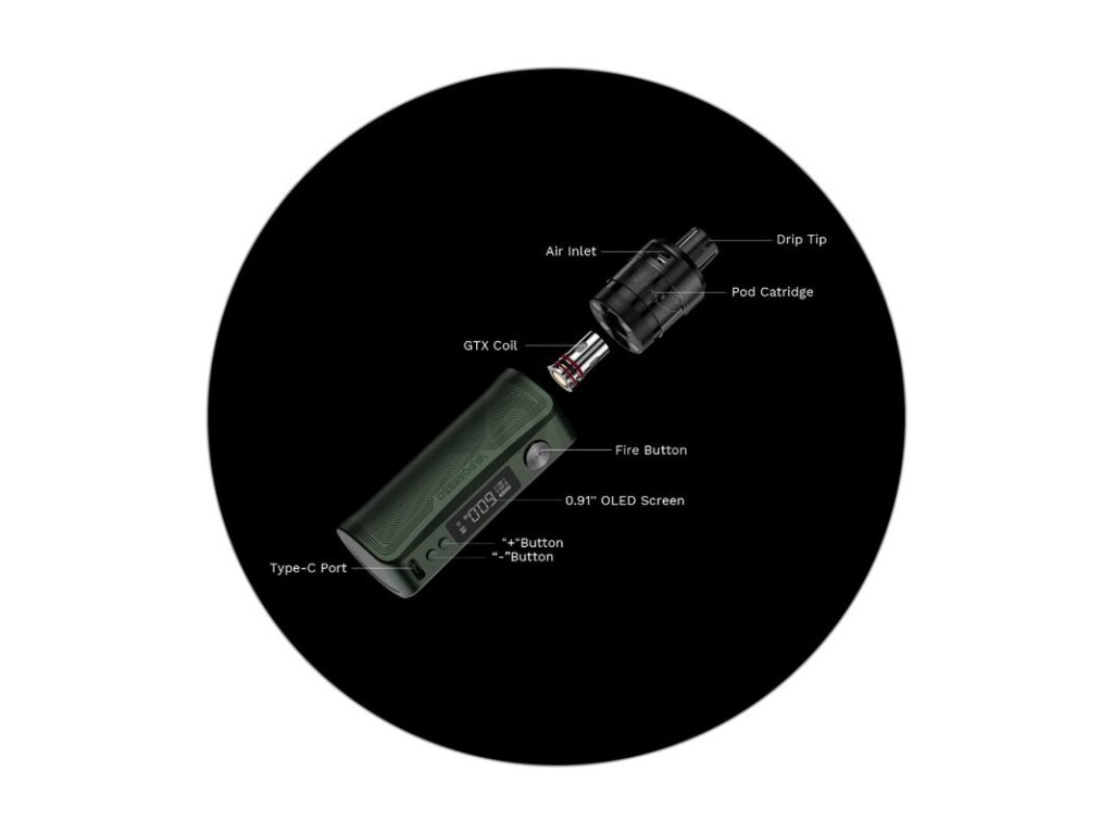 V přední části modelu GEN PT60 se nachází přehledný ovládací panel tvořený dvěma regulačními tlačítky, spínacím tlačítkem a velkým OLED displejem. Na displeji se zobrazují všechny potřebné parametry, stejně jako aktuálně nastavený výkon, který můžete regulovat v rozpětí 5 - 60 W. Díky elektronickému čipu v těle se navíc můžete těšit na funkci smart, která automaticky načte odpor tělíska a zvolí vhodný odpovídající výkon, aby nedošlo k poškození tělíska. Ve vrchní části se nachází praktická cartridge X Tank s obrovským objemem 4,5 ml a inovativním dvojitým systémem vrchního plnění a vrchního airflow. Cartridge zároveň nabídne vylepšenou technologii SSS 2.0 pro ještě lepší eliminaci nadbytečného kondenzátu a pro automatickou cirkulaci e-liquidu uvnitř cartridge. Novinkou je také inovativní technologie COREX, se kterou bude každý e-liquid výraznější, než kdy předtím. Tělíska s touto technologií nabídnou větší odpařovací plochu a rychlejší náběh žhavení, stejně jako jiný typ vaty pro lepší savost. V balení potom najdete tělíska GTX s odpory 0,2 ohm a 0,4 ohm pro přímé potahování. Vaporesso GEN PT60 Pod Kit je kompatibilní s celou rodinou tělísek GTX, samostatně si tak můžete pořídit opravdu velké množství hlav. Vaporesso GEN PT60 je pokročilejší pod systém vhodný pro všechny příznivce DL vapingu.