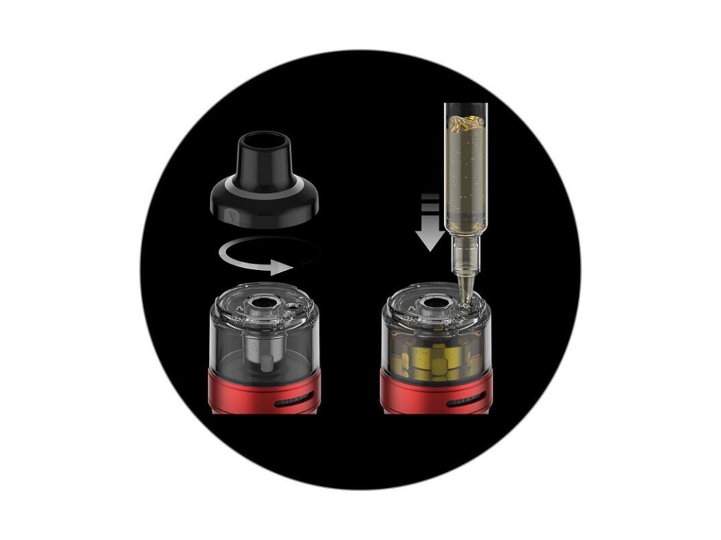 Ve vrchní části se nachází cartridge Vaporesso GTX POD 22. Tato cartridge nabídne objem 3,5 ml a praktický systém vrchního plnění, kdy stačí jen pootočit náustkem a začít plnit. Cartridge nabídne také spodní regulaci airflow a přepracovanou konstrukci, která eliminuje možný únik e-liquidu a značně omezuje vznik kondenzátu během používání.
