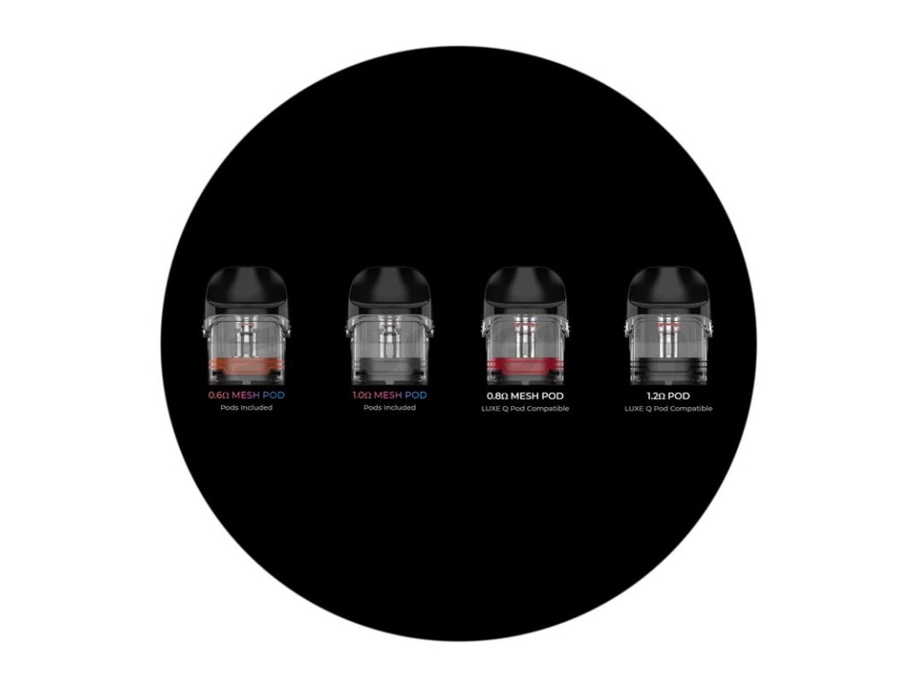 Součástí základního balení jsou dvě nové cartridge ze série Vaporesso LUXE Q. Tyto cartridge nabídnou pečlivě navrženou konstrukci s technologií SSS Leak-Resistant, výborné podání chuti, objem 2 ml a integrovaná tělíska s mesh pletivem. První cartridge disponuje odporem 0,6 ohm a je vhodná pro vzdušnější potah. Druhá cartridge nabídne odpor 1,0 ohm a je ideální pro utažené potahování a pro užívání nikotinových solí. Zařízení je zpětně kompatibilní také s první generací cartridgí LUXE Q.