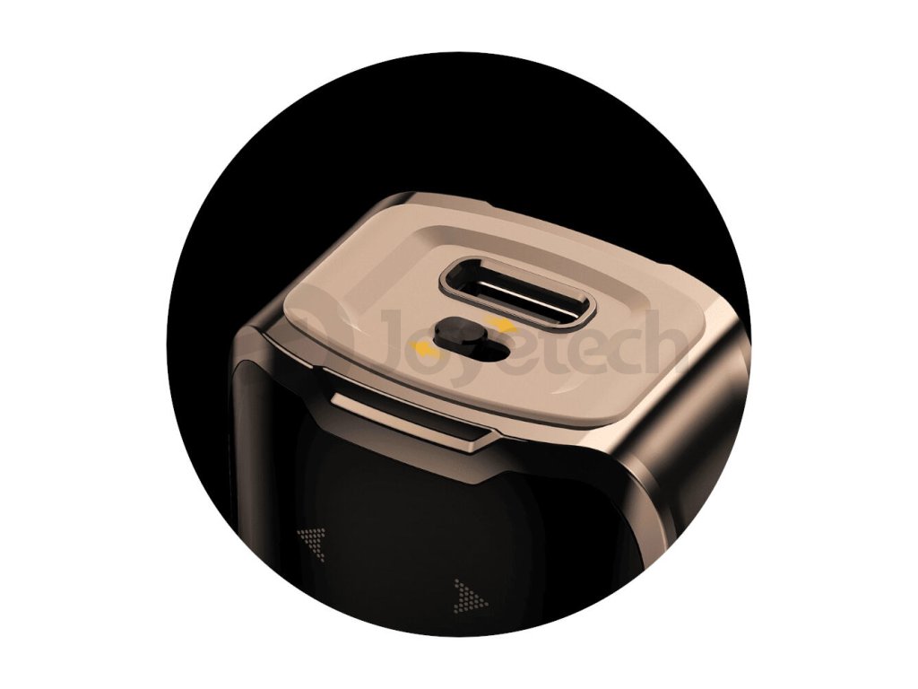 Dalším zajímavým prvkem je manuální posuvník Airflow na boční straně zařízení. Je totiž výrazně větší než u mnoha jiných podobně výkonných pod systémů. Žádné drobné průduchy, ale pořádně velký otvor, který je dimenzovaný na maximální výkon až 80 W a umožňuje velmi vzdušné potahování s velkou produkcí páry.
