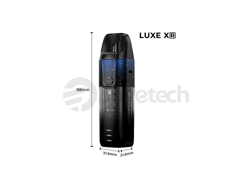 Vaporesso LUXE XR Pod Kit rozšiřuje možnosti využití proti standardní verzi elektronické cigarety LUXE X a přináší novinku v podobě speciálních cartridgí na vyměnitelné žhavící hlavy. Celé zařízení si potom zachovává krásu a eleganci původního modelu LUXE X, přináší však ještě tři nové barevné varianty Galaxy s ještě větším důrazem na futuristické konstrukční prvky. Tělo e-cigarety nabídne stylovou transparentní konstrukci a praktické rozměry 98 x 31,6 x 21,6 mm. Díky pečlivě navržené konstrukci se příjemně drží v dlani a působí nesmírně elegantním dojmem. V těle e-cigarety LUXE XR se potom ukrývá integrovaná baterie s velkou kapacitou 1500 mAh pro intenzivnější používání. Baterii si budete moci dobíjet prostřednictvím portu USB-C proudem až 1.5A.