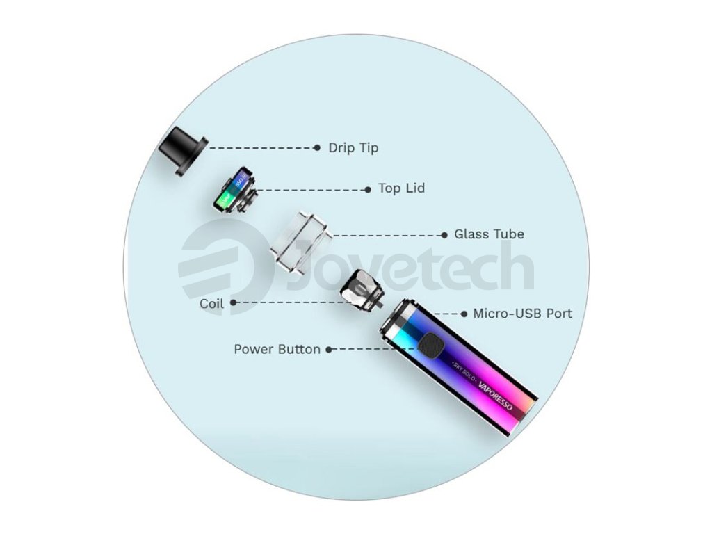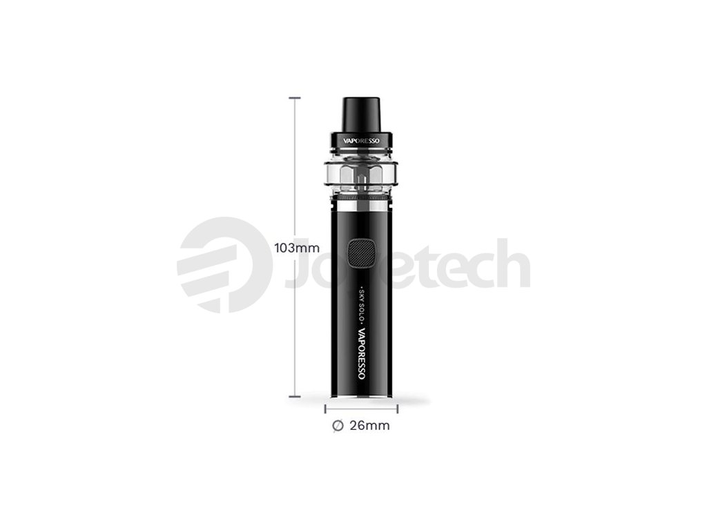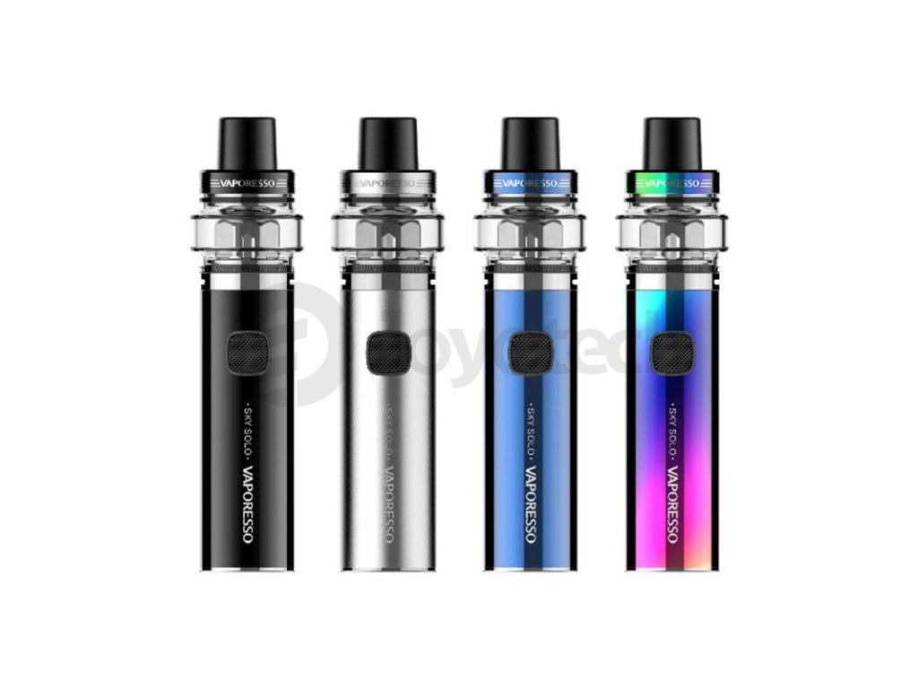 Vaporesso Sky Solo Kit je nový a praktický model elektronické cigarety s tradičním trubkovým designem. E-cigareta je určena k přímému potahování do plic a cílí zejména na začátečníky, nabízí jednoduchou obsluhu a snadné ovládání, výborné podání chuti a solidní objem clearomizéru. Její délka činí 103 mm a průměr je potom 26 mm. Díky tradiční trubkové konstrukci se z ní příjemně vapuje a můžete ji také pohodlně přenášet v kapse, nebo v cestovním zavazadle. Na výběr je hned několik barevných provedení. Vybere si opravu každý. V těle se nachází integrovaná baterie s kapacitou 1400 mAh, jež si bez problému poradí s několikahodinovým intenzivním provozem. V případě vybití navíc jednoduše připojíte microUSB kabel a baterii dobijete pomocí počítače, nebo adaptéru do sítě.