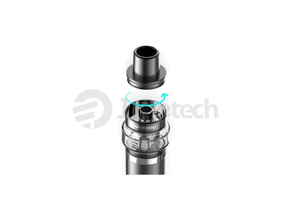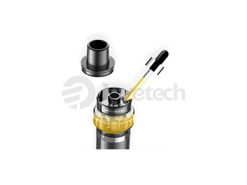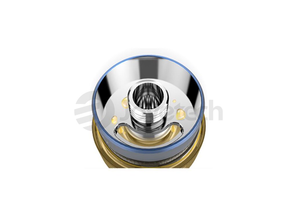 Tank nabídne velký objem 3,5 ml, který si bez problému poradí s několikahodinovým intenzivním používáním bez nutnosti plnění. Pokud však na plnění přeci jen dojde, potěší vás přítomnost praktického vrchního systému doplňování. Jednoduchým pohybem odšroubujte vrchní uzávěr a doplňujte e-liquid podle potřeby. Ve vrchní části je potom umístěn speciální bazének, který zabrání možnému úniku po stěnách atomizéru při případném přeplnění tanku, lze ho tedy efektivněji udržovat v čistotě.