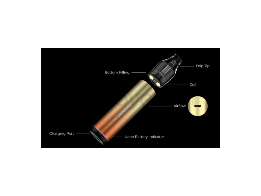 Elektronická cigareta Vaporesso VECO GO je perfektní vapovací zařízení ve stylu pera pro začátečníky, kteří hledají jednoduchost bez kompromisů v kvalitě vapingu. Elegantní a stylový designe baterie disponuje vestavěným monočlánkem o kapacitě 1500mAh s rychlonabíjením typu USB-C 5V/2A a automatickým výkonem až 25W. Vyměnitelná cartridge (POD) je vybavena žhavící hlavou o odporu 0,6ohm a 0,8ohm s objemem nádržky 5ml. Díky magnetickému propojení s baterií lze cartridge jednoduše vyjmout a doplnit oblíbeným liquidem. VECO GO využívá technologii zahřívení spirálky COREX, která zajišťuje přesné podání chuti a delší životnost. Magnetická podložka umožňuje regulaci proudění vzduchu pro optimální nastavení.