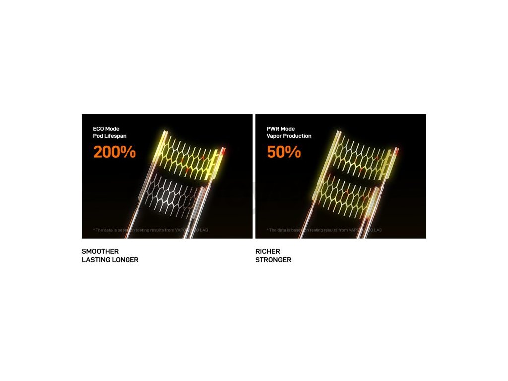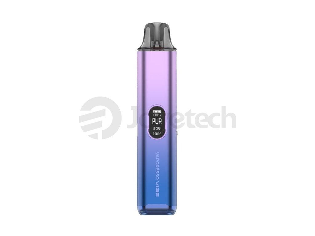 Vaporesso Vibe Pod Kit. Novinka zaujme nejen moderním vzhledem, ale především inovativní technologií Dual Mesh Coil, která přináší plnější chuť liquidu a delší životnost cartridge. Tělo baterie je vyrobeno z lehkého a odolného materiálu, který v sobě ukrývá monočlánek o kapacitě 1100mAh s rychlým USB-C nabíjením (5V/2A) a výkonným čipem AXON. Ten umožňuje přepínání mezi režimy ECO (úsporný výkon) a PWR (plný výkon), přičemž zařízení zároveň umožňuje regulaci airflow a přizpůsobení potahu od utaženého po volný. Na přední straně je barevný 0,54" TFT displej, který informuje o stavu baterie i aktuálním režimu. Vyměnitelná cartridge o objemu 4,5ml je navržena pro maximální výdrž.