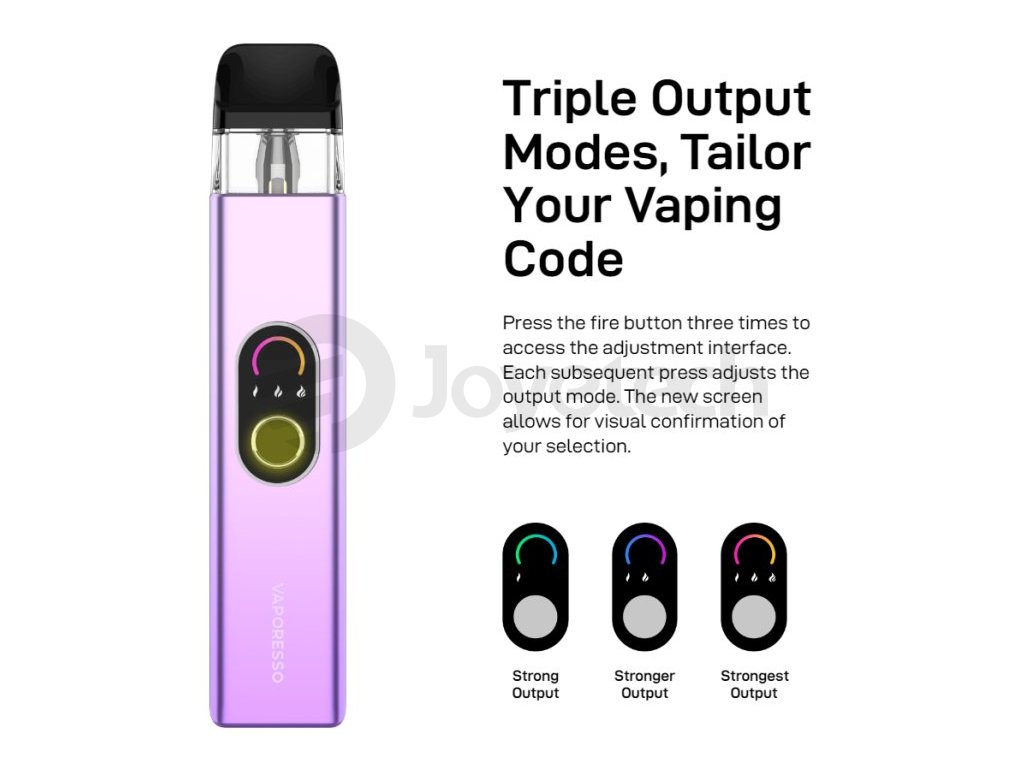 Oblíbenost elektronických cigaret XROS od Vaporessa stále strmě stoupá vzhůru. Proto se výrobce rozhodl představit již čtvrtou řadu tohoto prvotřídního zařízení s technologií Corex Heating Tech pro konzistentní chuť liquidu. Tělo baterie je vyrobeno z kvalitní hliníkové slitiny, které obsahuje monočlánek o kapacitě 1000mAh s USB-C nabíjením a moderním AXON čipem. Na přední straně baterie se nachází spínací tlačítko a přehledný displej, který Vás informuje o stavu nabití baterie a umožním vám nastavení výstupního režimu. Vyměnitelná cartridge XROS o objemu 3ml je kompatibilní se všemi modely této řady. Na vrchní straně baterie je umístěna důmyslná regulace přívodu vzduchu zajišťující skvělou dýmivost a autentickou chuť liquidu.
