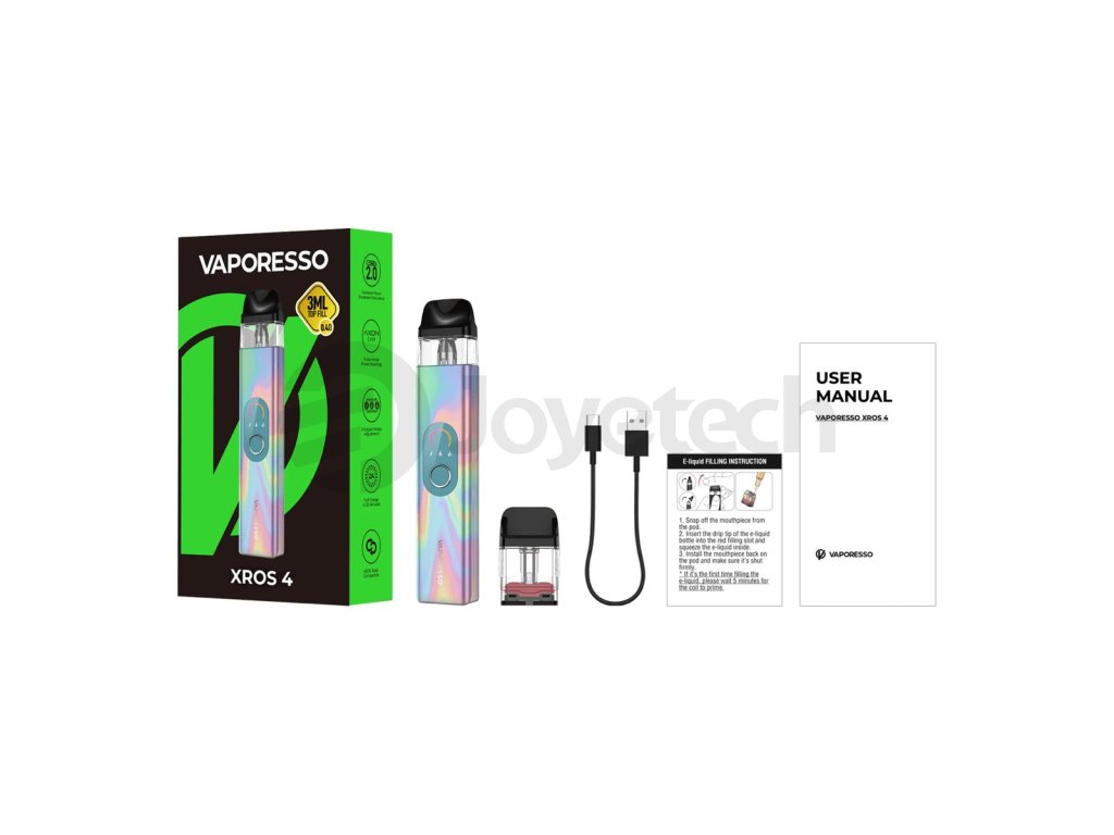 Čtvrtá generace oblíbené modelové série XROS s názvem Vaporesso XROS 4 Pod Kit uvádí na trh vylepšenou technologii COREX 2.0 pro mnohem intenzivnější chuť a delší životnost cartridgí. Výkonný Pulse režim zajistí vysoký výstupní výkon a rychlý náběh žhavení. U e-cigarety nesmí chybět ani prvotřídní čipset AXON, tři výstupní režimy intenzity a praktický indikační displej. V základním balení se nachází také nová cartridge s odporem 0,4 ohm, přičemž je zařízení zpětně kompatibilní také s kompletní platformou všech dalších podů XROS. Novinkou je také přepracované tělo s celohliníkovou konstrukcí pro komfortnější stisk, nižší hmotnost a ještě futurističtější estetiku.