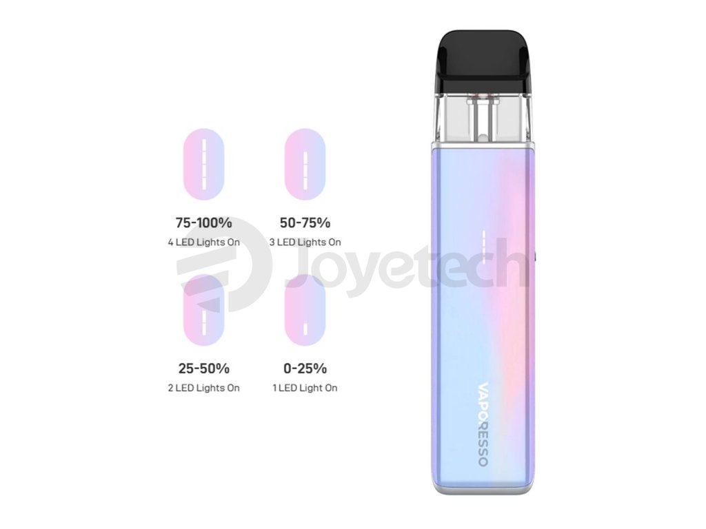 Přední část e-cigarety XROS 5 Mini zdobí praktická indikační dioda, kterou tvoří čtyři oddělené čárky. Skrz tuto indikaci budete mít neustálý přehled o aktuálním stavu vaší baterie. Indikátor je velice detailní a určuje zbývající kapacitu odděleně po 25% procentech, nemusíte tak mít obavy, že byste nedokázali dopředu předem určit, kolik vám zbývá baterie.