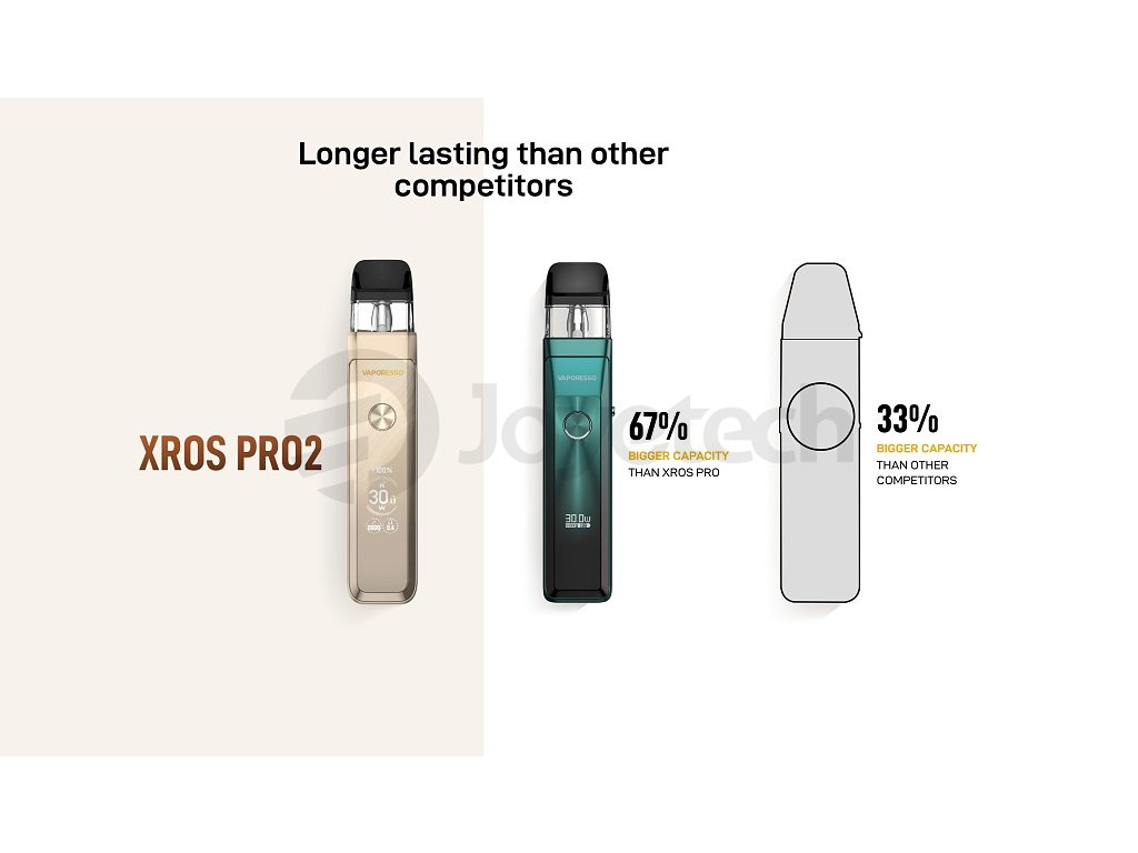 Integrovaná baterie o kapacitě 2000 mAh představuje největší kapacitu v celé řadě XROS a poskytuje až o 67 % delší výdrž než původní XROS Pro. Pro intenzivní uživatele s cartridgem 0,4 Ω při 25 W vydrží baterie jeden a půl dne, při umírněném MTL vapování s vyšším odporem a nižším výkonem až dva plné dny nepřetržitého používání.