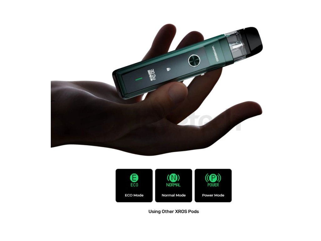 XROS PRO je nejpropracovanější a nejvýkonnější elektronická cigareta řady XROS od Vaporessa. Důmyslně zpracované tělo baterie disponuje monočlánkem o kapacitě 1200mAh, moderním displejem a především čipem AXON, který nabízí režimy Super Pulse (stálý výkon bez ohledu na stavu nabití baterie), ECO, Normal a Power s výkonem až 30W. XROS PRO je osazena cartridgí s vrchním plněním, objemem nádržky 3ml a Mesh spirálkou o odporu 0,4ohm. Tato cartridge je vybavena technologií COREX Heating Tech - příjemný vaping v kombinaci husté páry a vyladěné chuti liquidu. Cartridge je plně kompatibilní s předešlými modely