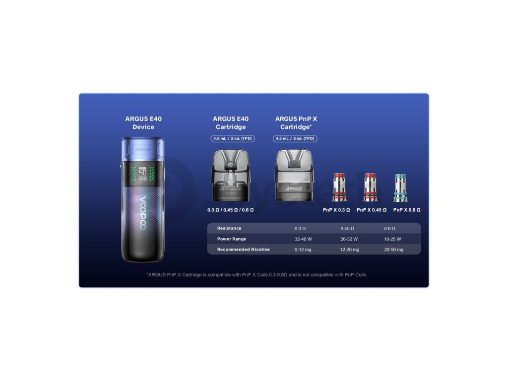 VooPoo Argus E40 Pod je dalším zařízením z rozrůstající se platformy PnP-X. V základním balení najdete cartridge s integrovanou hlavou, samostatně si však můžete k zařízení pořídit také prázdnou cartridge, která je kompatibilní se žhavícími hlavami z platformy VooPoo PnP-X s odporem vyšším než 0,3 ohm. Díky tomu získáte větší svobodu při výběru vhodných součástí pro každodenní využití.