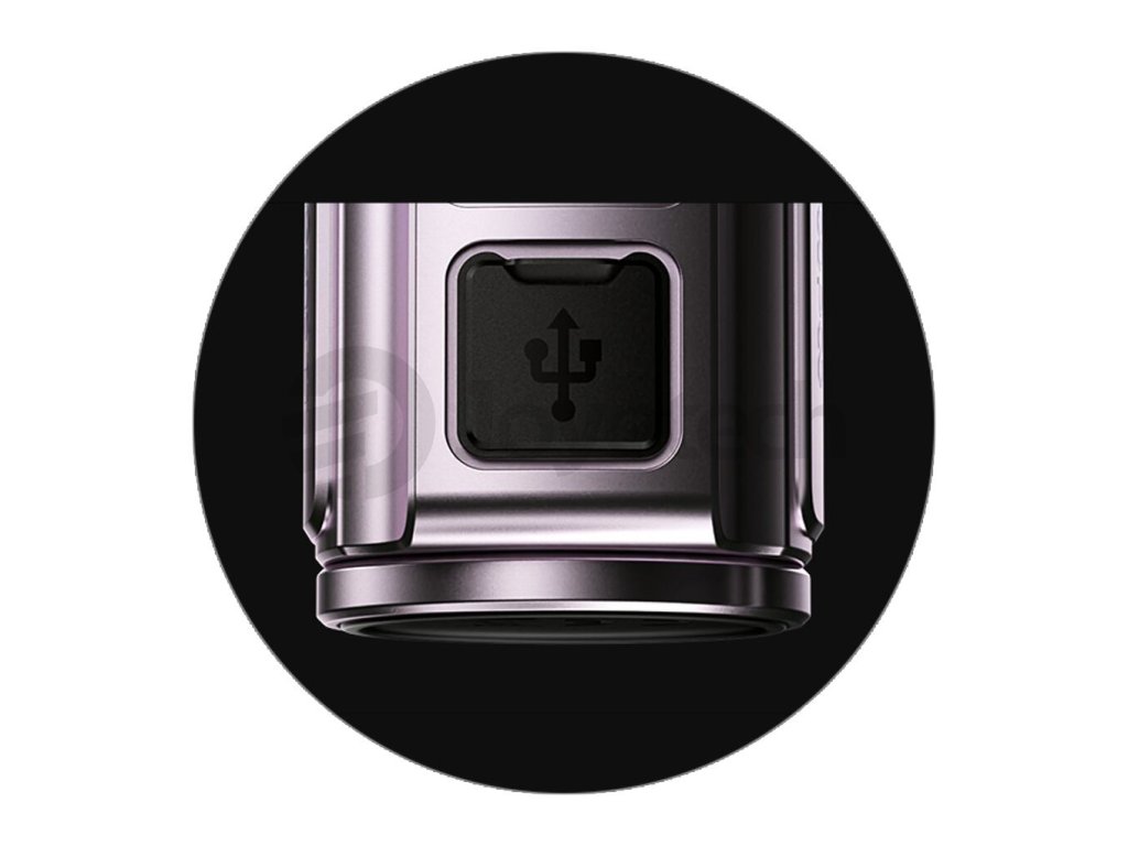 V robustním těle nesmí chybět ani integrovaná baterie s ohromující kapacitou. Ta činí krásných 3000mAh, zařízení tak hravě zvládne uvedený vysoký výstupní výkon a intenzivní vapování. Baterii si můžete kdykoliv pohodlně dobít pomocí portu USB-C, který se nachází na předním panelu. Dobíjecí port navíc disponuje speciální silikonovou krytkou, která ho chrání před usazováním prachu.