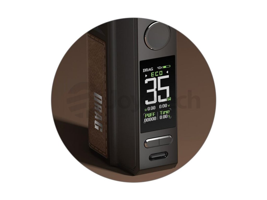 Zařízení Drag E60 podporuje hned tři výstupní režimy. Stejně jako u předchozích verzí Drag, i zde najdete oblíbený SMART režim pro inteligentní nastavení výkonu a RBA režim pro variabilní nastavení výkonu v rozpětí 5 - 60 W. Nově se k nim však přidává také pokročilý ECO režim, který umožňuje pohodlné žhavení i v případě, že kapacita baterie poklesne pod 40%. Režim efektivně šetří vaši baterii a umožňuje vapování také s nižším výstupním napětím.