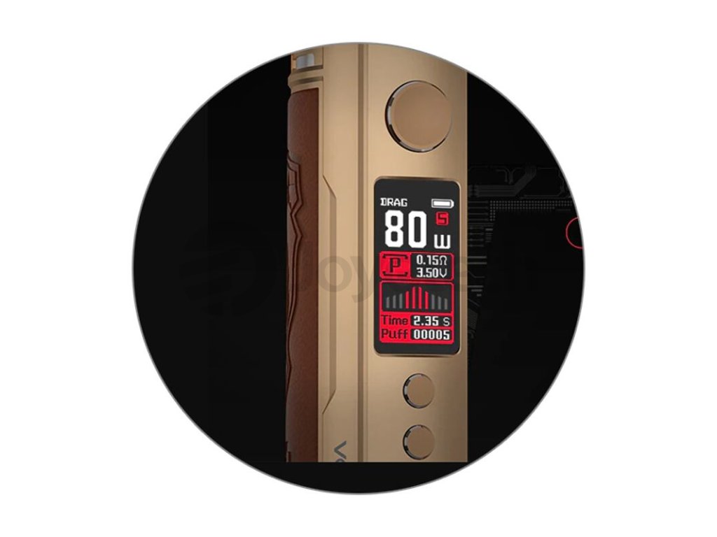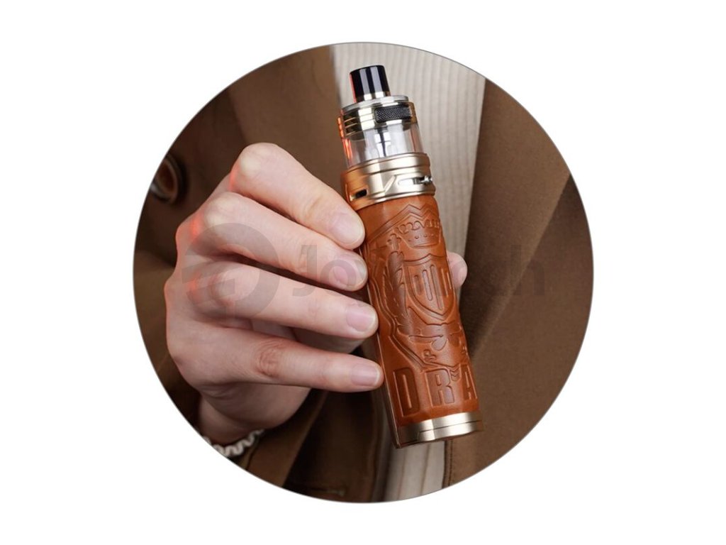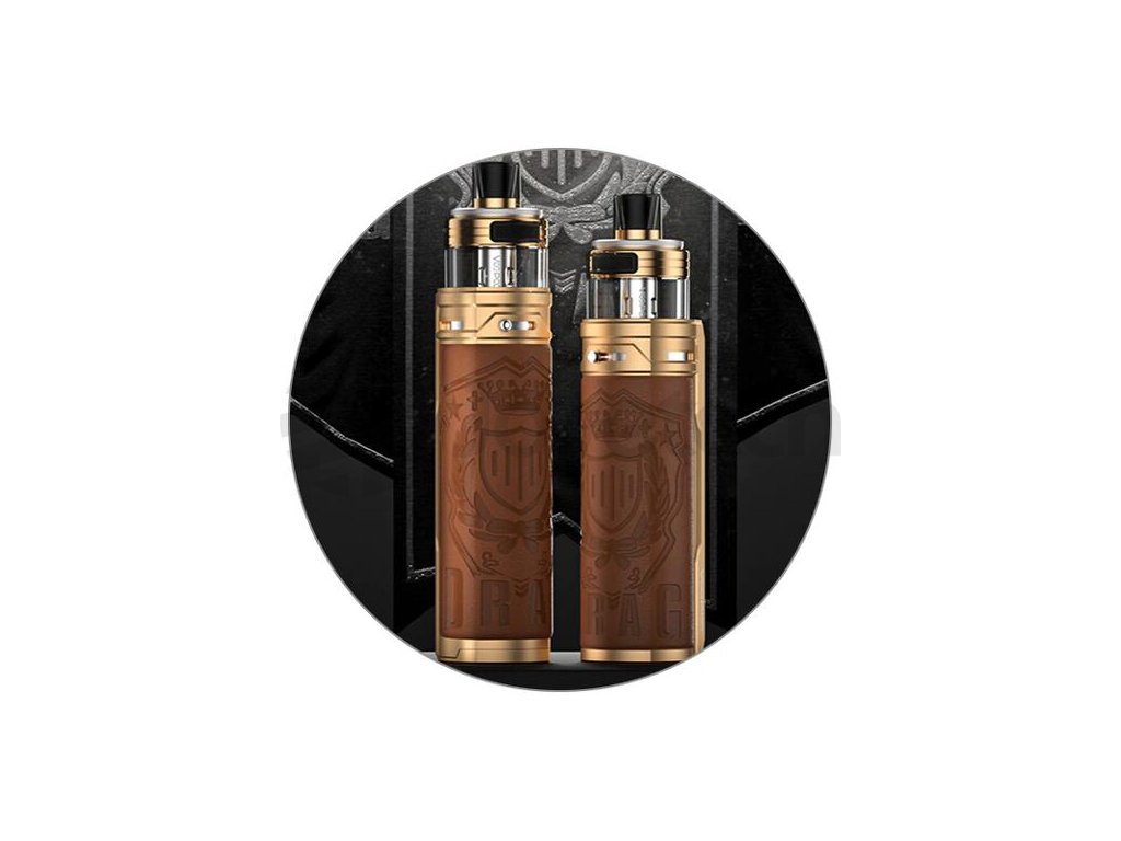 Nová verze populární e-cigarety VooPoo Drag S Pod Kit přichází s ještě ergonomičtějším zpracováním a s ještě stylovějším designem. Kovové tělo zařízení je doplněno o stylový kožený potah s motivem série v zadní části. Rozměry e-cigarety činí jen 119,5 x 33 x 28 mm. Díky zaoblené zadní části se perfektně drží v ruce a působí nesmírně robustním a bytelným dojmem, nechybí jí však také punc elegance.