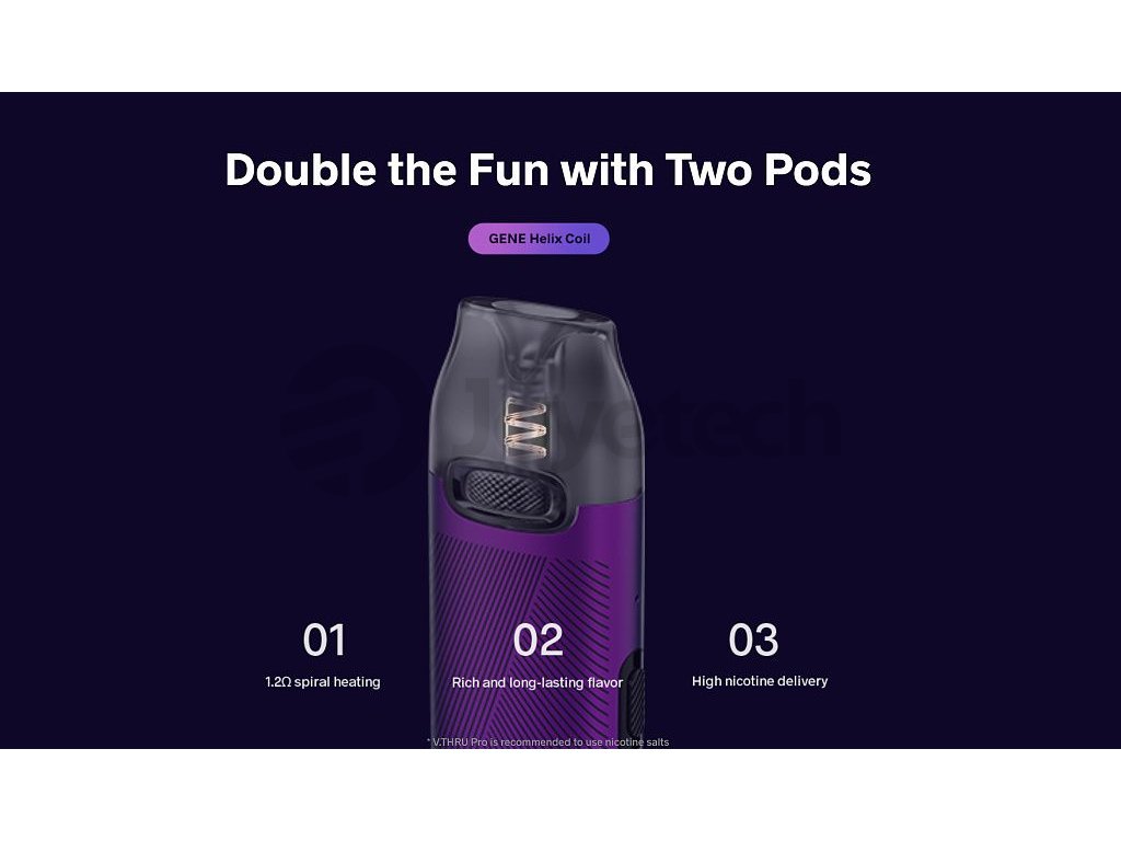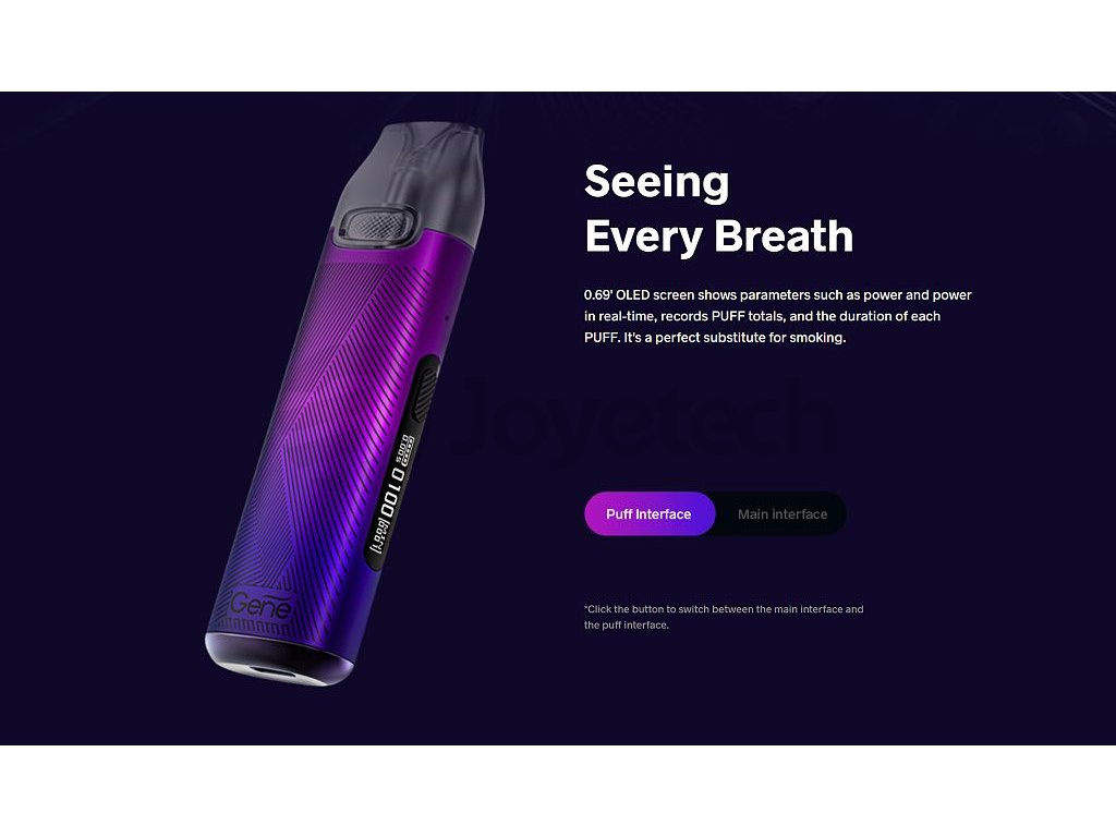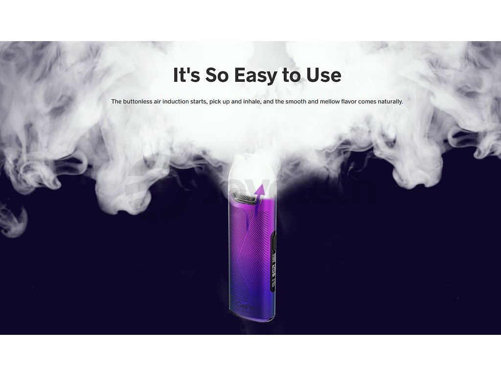 Cigaretu pohání čip GENE, který dodává konstantní výstupní napětí. Těšit se tak můžete na dokonale hladký a příjemný potah, nebo na možnost regulace výstupního výkonu. Ten lze regulovat v rozmezí 5 - 25 W pomocí jednoho jediného tlačítka. Na 0,69 palcovém OLED displeji se zobrazují veškěré potřebné informace o zařízení. Elektronická cigareta disponuje inteligentním režimem dětské pojistky, aby se zabránilo náhodnému spuštění dětmi. Samotná Pod Cartridge disponuje magnetickým uchycením a její doplňování a případná výměna je tak otázkou několika málo vteřin.