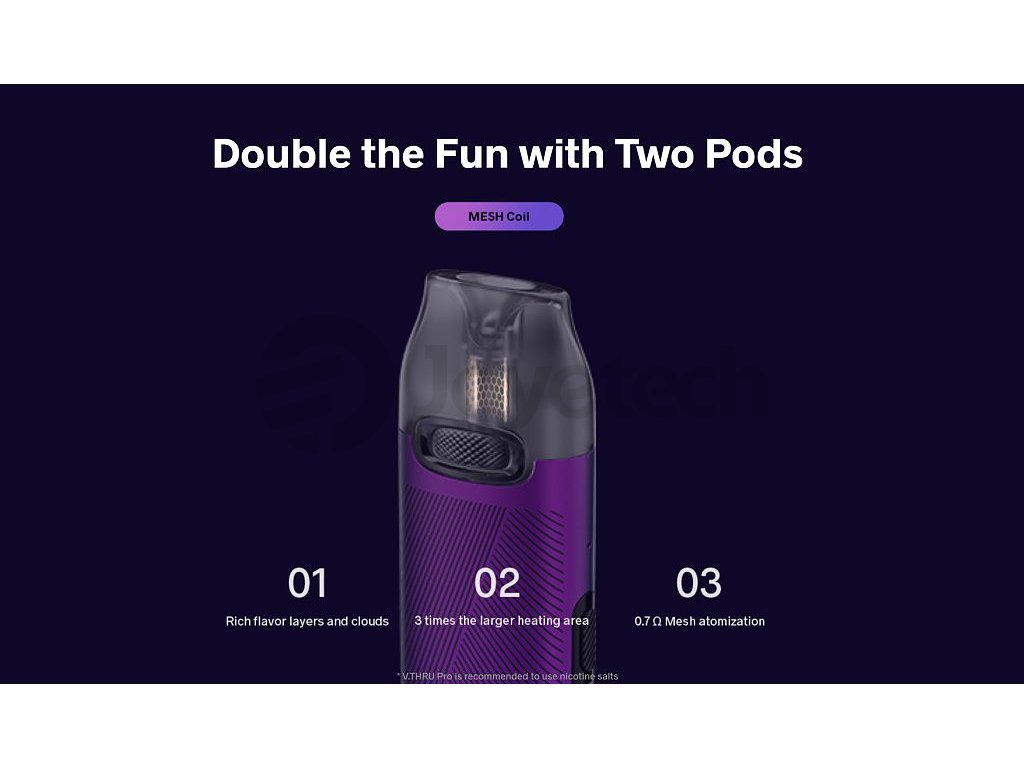 Možnost nastavení výkonu Elektronická cigareta Voopoo V.THRU Pro nabízí vskutku malé rozměry, ale také nízkou hmotnost, díky čemuž jí lze velmi snadno přenášet v téměř jakékoli kapse. Na 0,69 palcovém OLED displeji se zobrazují veškěré potřebné informace o zařízení. Elektronická cigareta disponuje inteligentním režimem dětské pojistky, aby se zabránilo náhodnému spuštění dětmi. Samotná Pod Cartridge disponuje magnetickým uchycením a její doplňování a případná výměna je tak otázkou několika málo vteřin.