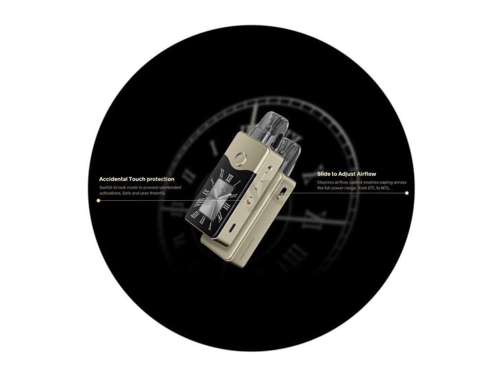 V boční části se nachází jednoduchý manuální posuvník, který slouží pro efektivní uzamčení nebo odemčení celé e-cigarety. Po uvedení zařízení do uzamčeného stavu není možné regulovat výstupní výkon ani spínat žhavení. Můžete tak svou e-cigaretu bezpečně přenášet v kapse nebo cestovním zavazadle a nemusíte se obávat nechtěného přenastavení výkonu nebo nechtěného sepnutí žhavení a poškození žhavící hlavy.
