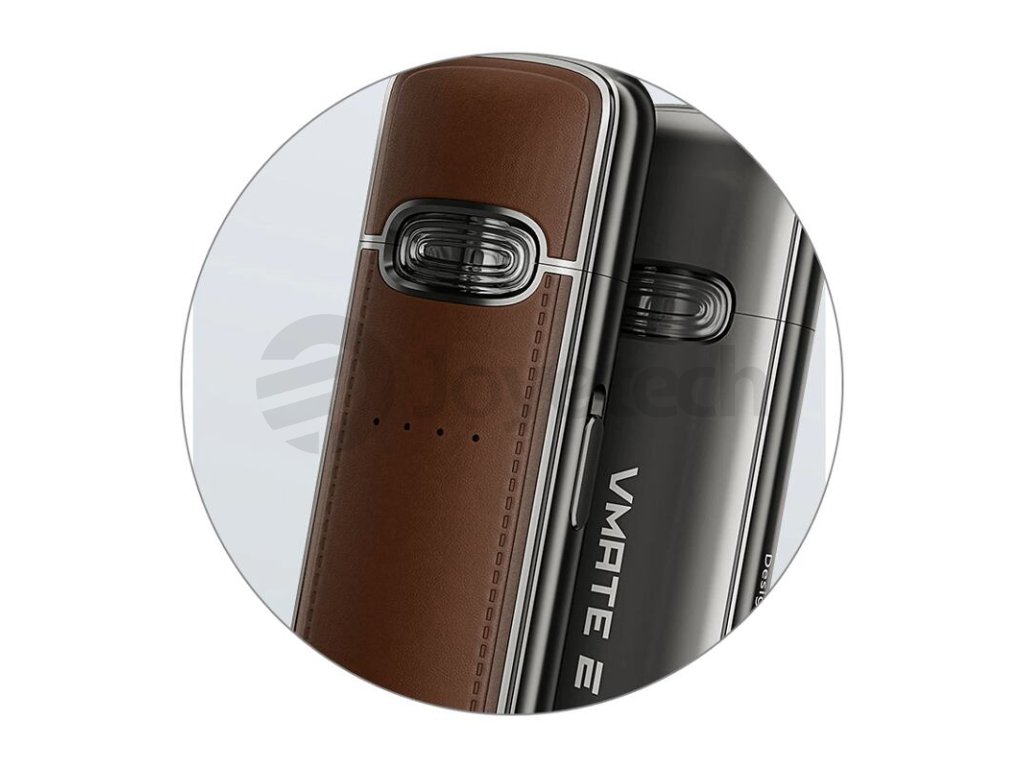 VooPoo VMATE E Pod Kit je luxusně zpracovaná e-cigareta pro klasické šlukování, která nádherně doplňuje celou sérii VMATE. Jedná se o zajímavý model zejména z hlediska estetiky, nabídne však také velice solidní parametry v čele s velkou kapacitou baterie, díky čemuž si její používání velice snadno oblíbíte. Samotné tělo je vyrobeno z kombinace zinkové slitiny a kůže. K dostání je ve třech barvách s tradiční šedou konstrukcí, nebo ve třech barvách pro náročnější, které nabídnou kovovou konstrukci s pozlaceným povrchem pro co nejstylovější vzhled. Rozměry těla činí 99,5 x 30,5 x 17 mm, díky svému ergonomickému zpracování a kompaktním rozměrům padne e-cigareta perfektně do ruky a pohodlně se užívá. Hlavní výsadou je potom speciální krytka náustku ve vrchní části, která zabraňuje vniknutí nečistot při cestování, nebo při každodenním používání, do samotného náustku. E-cigaretu tak můžete neustále udržovat v čistotě a užívat si pohodový vaping naprosto kdykoliv.