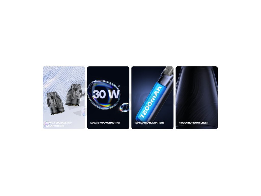 Prémiový výrobce elektronických cigaret VOOPOO představuje svojí ,,vlajkovou POD loď´´ VMATE MAX, která Vás na první pohled oslní svým jedinečným designem. Na přední straně baterie se nachází luxusní OLED displej (Hidden Horizon Screen) pro snadné nastavení a zobrazení hodnot. Vestavěný monočlánek disponuje kapacitou 1200mAh s rychlonabíjením typu USB-C 5V/2A. Moderní čip GENE přináší nastavitelný výkon až 30W a režimy SPT, NOR a ECO. Tato sada s sebou přináší i nové a vylepšené cartridge VMATE TOP FILL s vrchním plněním a autentičtější chutí liquidu.