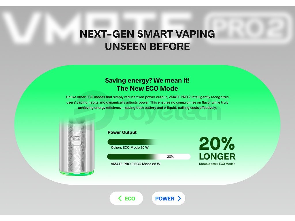 Duální režimyManuální přepínač na předním panelu umožňuje snadné přepínání mezi režimem POWER s regulací výkonu 5-30W a úsporným ECO režimem s automatickým nastavením. ECO režim optimalizuje spotřebu baterie při zachování výborného vapovacího zážitku. |