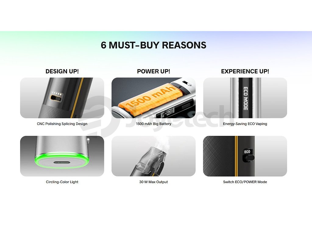 Duální režimyManuální přepínač na předním panelu umožňuje snadné přepínání mezi režimem POWER s regulací výkonu 5-30W a úsporným ECO režimem s automatickým nastavením. ECO režim optimalizuje spotřebu baterie při zachování výborného vapovacího zážitku. |